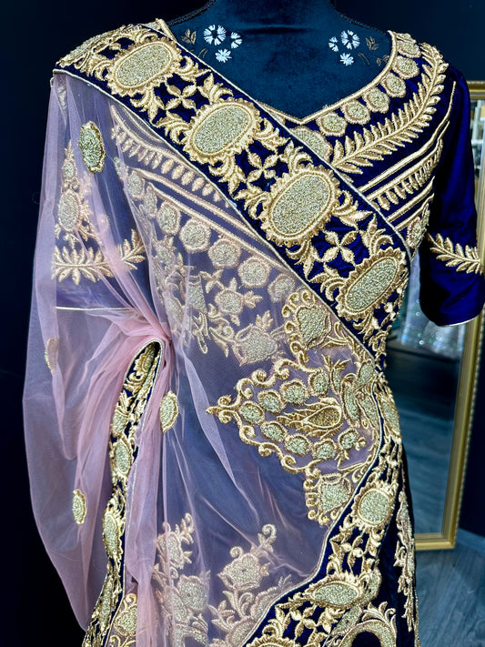 Donkerblauwe velvet lehenga met gouden borduurwerk – luxe Indiase avondjurk