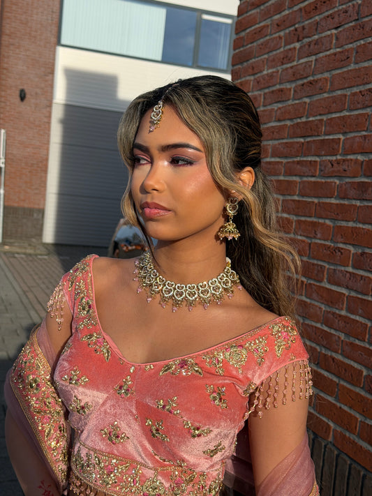 Onze collectie bestaat uit luxe kundan ketting sets, jhumka oorbellen, parel details en traditionele Indiase designs. Deze sieraden combineren perfect met outfits zoals lehenga’s, sarees en sharara sets.