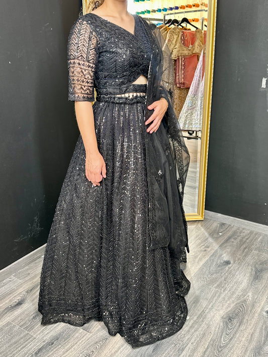 Zwarte designer lehenga met cut-out blouse en borduurwerk – indiase feestjurk