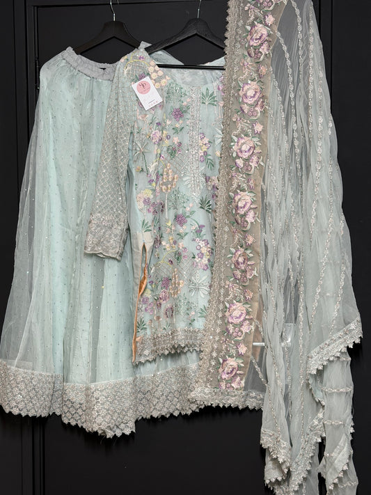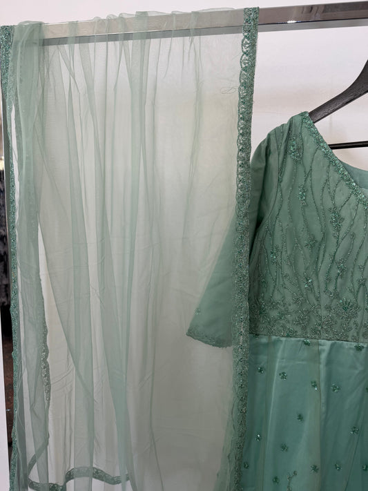 Mintgroene Anarkali met Fijn Borduurwerk & Dupatta