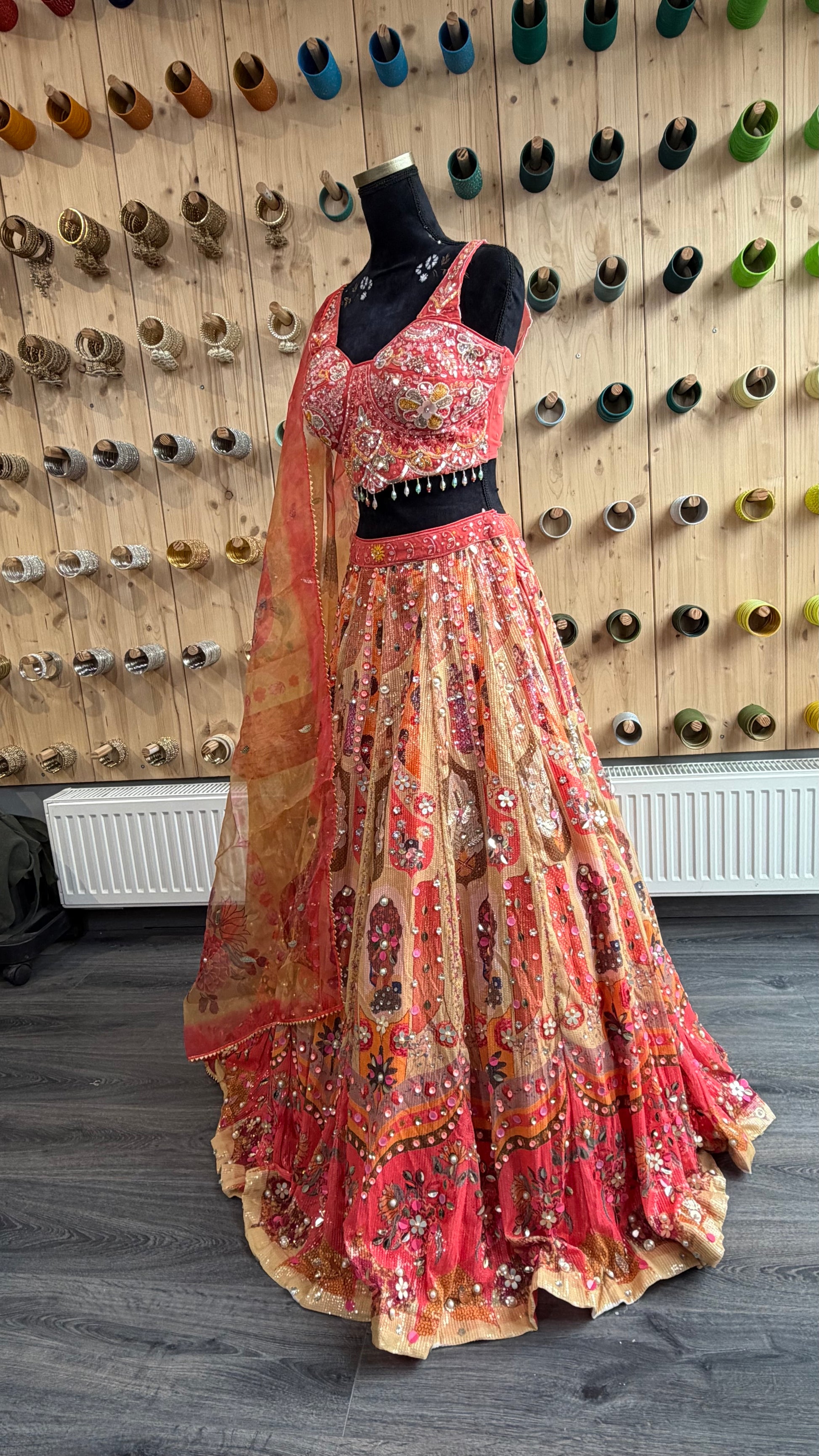 Deze fuchsia-gouden lehenga straalt pure elegantie uit. De rijke kleuren worden versterkt door gedetailleerde bloemmotieven en 3D embellishments. De rok heeft een klassieke uitstraling met moderne afwerking, terwijl de dupatta zorgt voor een sierlijke touch.
