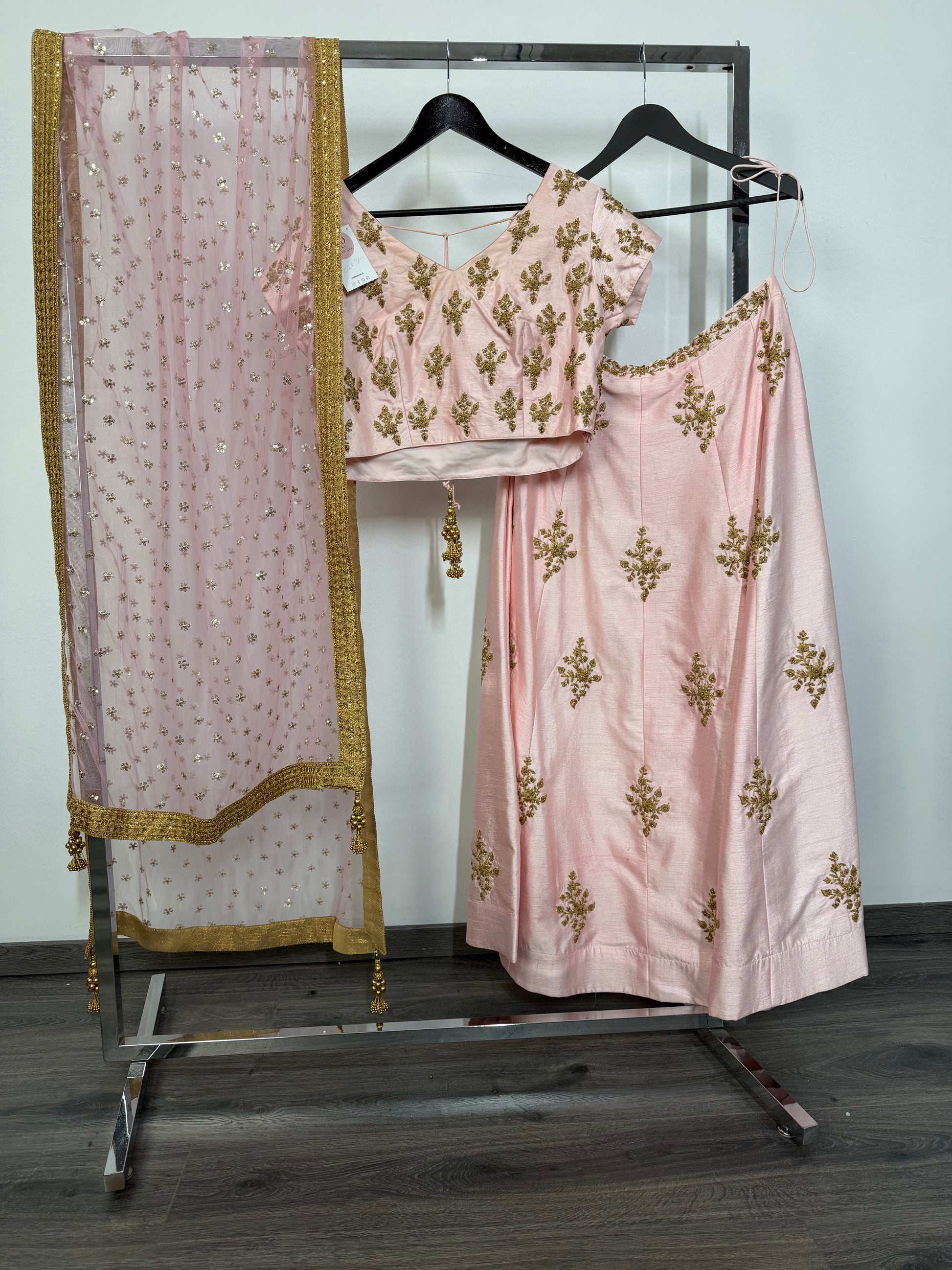 Een blush-roze zijden lehenga met gouden traditionele motieven, perfect voor liefhebbers van een zachte en elegante uitstraling. Ideaal voor daytime ceremonies, fotoshoots en bruidsgasten.