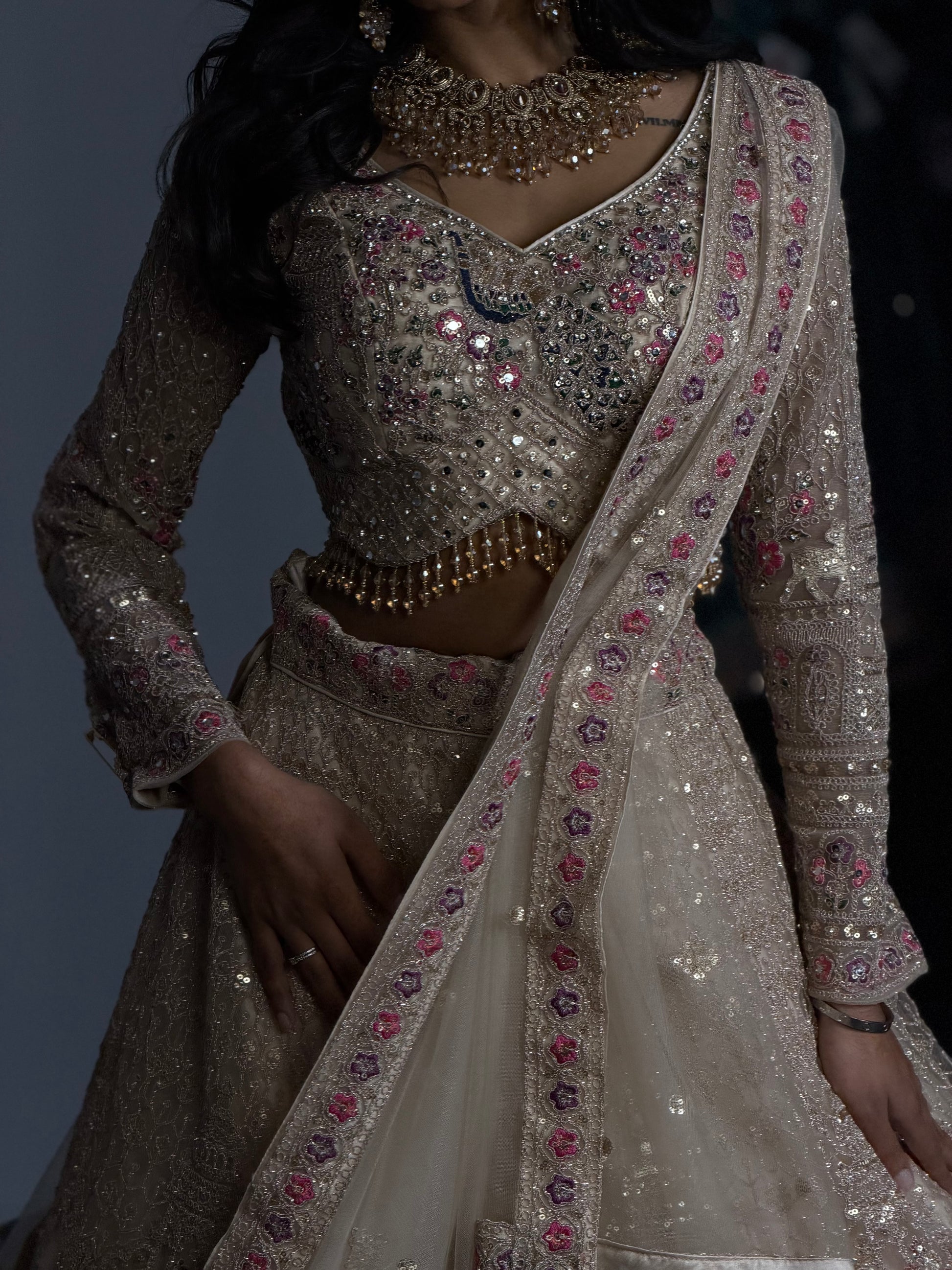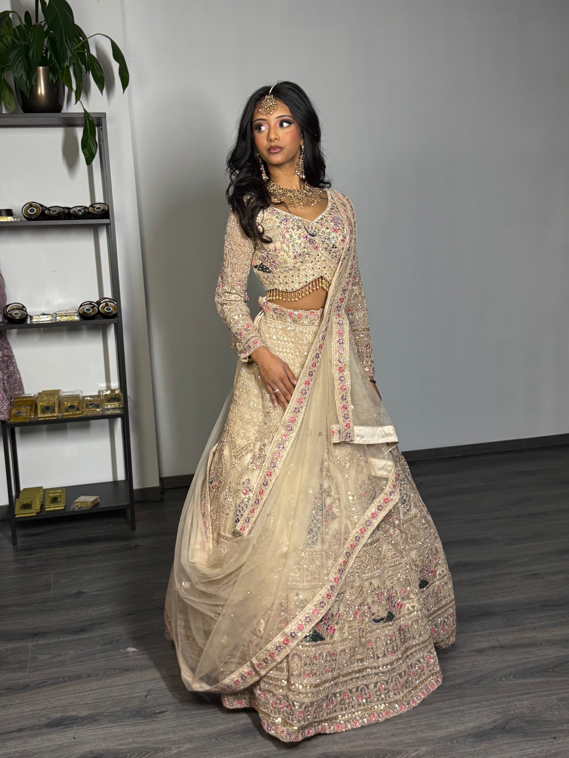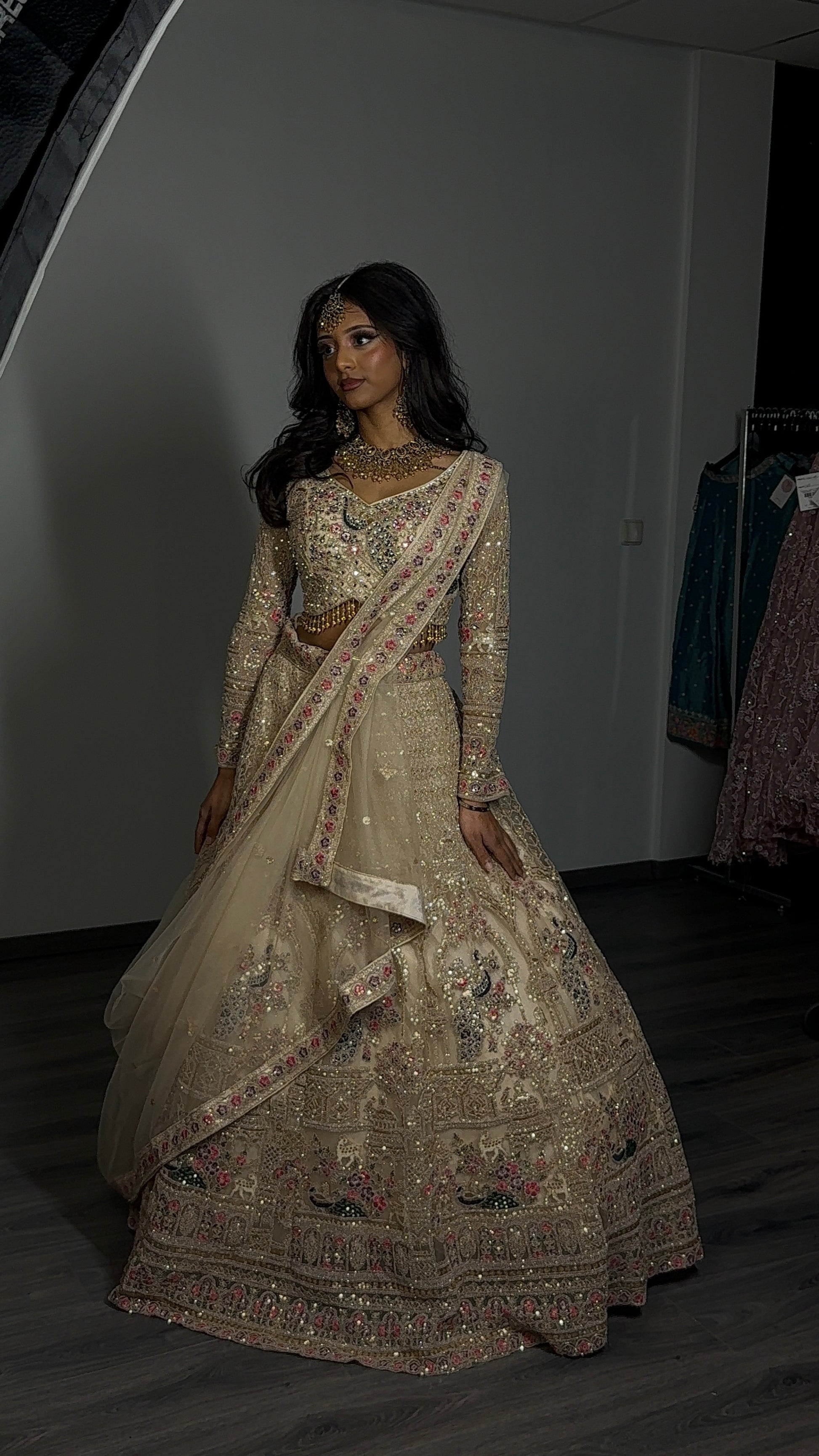 Een prachtige Indiase feestjurk die rijk aanvoelt, met fijn borduurwerk en iconische pauwdetails. De champagne-goud basis maakt haar geschikt voor feestelijke gelegenheden, zonder de ‘bridal’ intensiteit. Perfect voor verloofde (bruid-to-be) of een elegante gast.