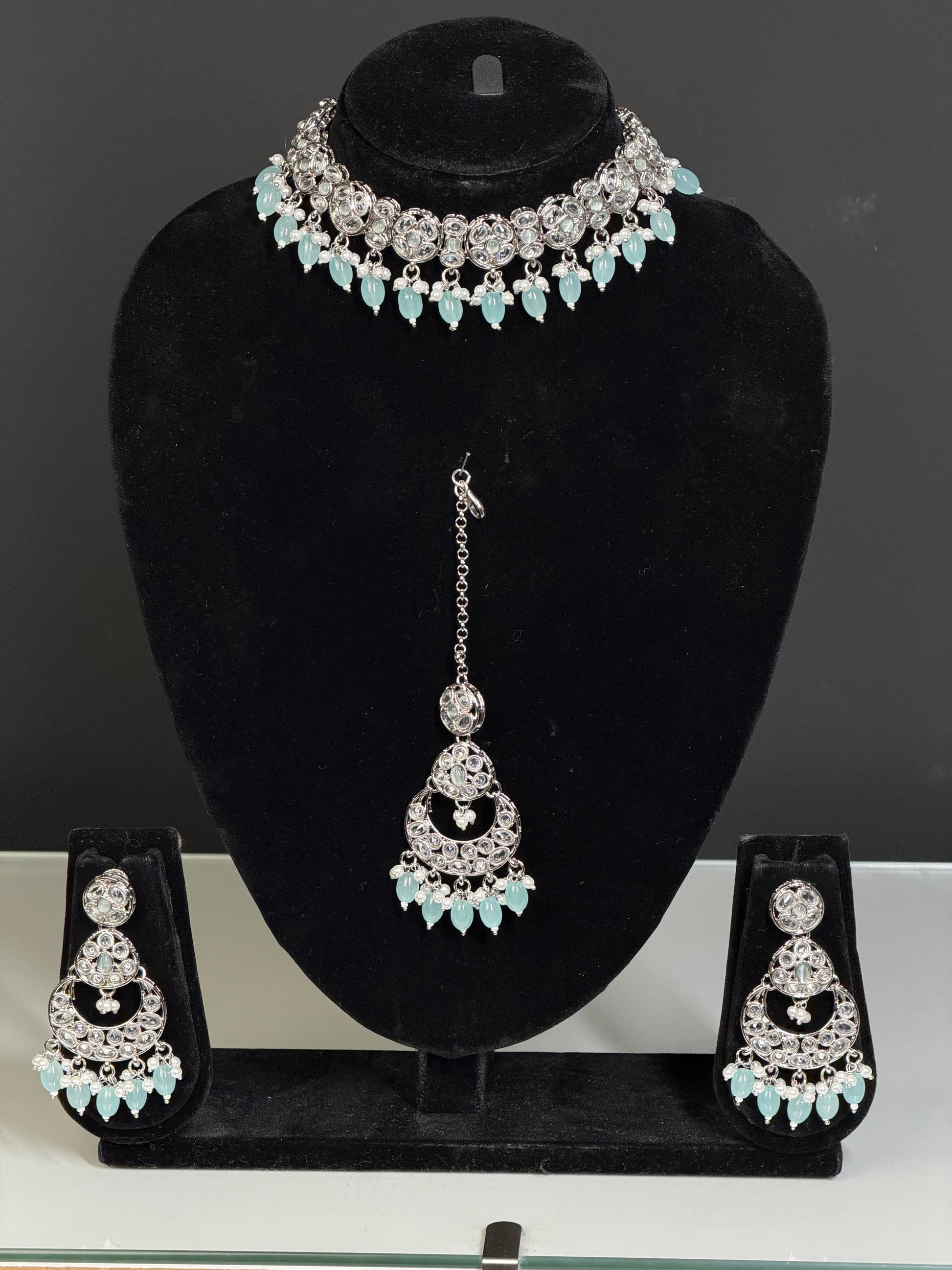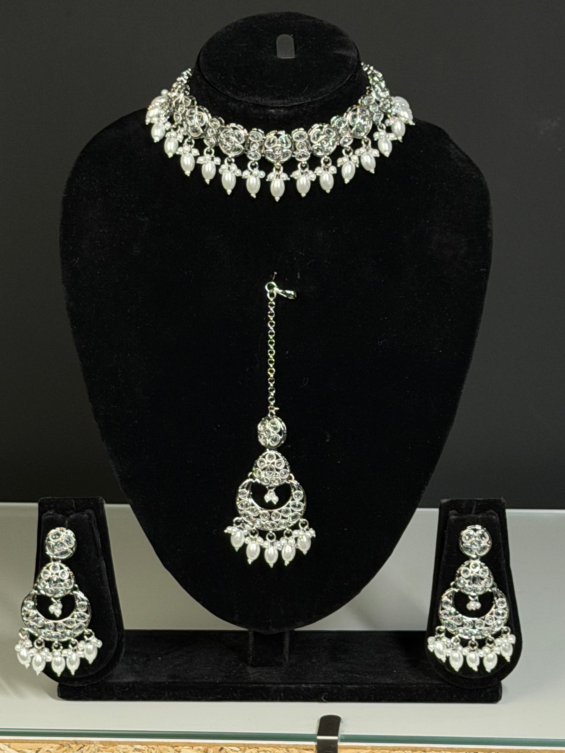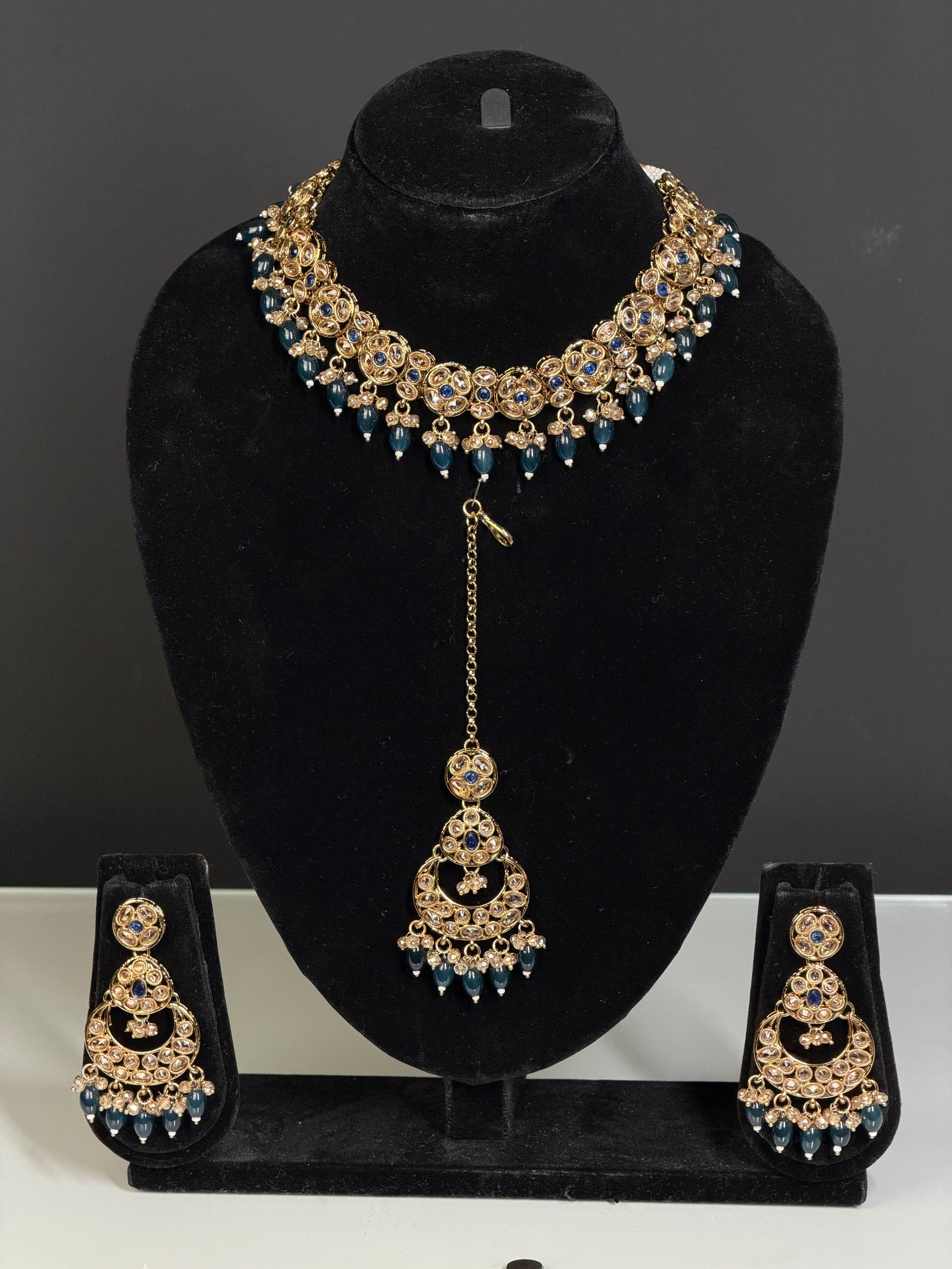 Een luxe choker-stijl ketting set met rijke details en een krachtige uitstraling. De set bestaat uit een korte ketting, oorbellen en maang tikka en is ontworpen voor een opvallende bridal of party look. Beschikbaar in verschillende kleuren, passend bij zowel traditionele als moderne outfits.