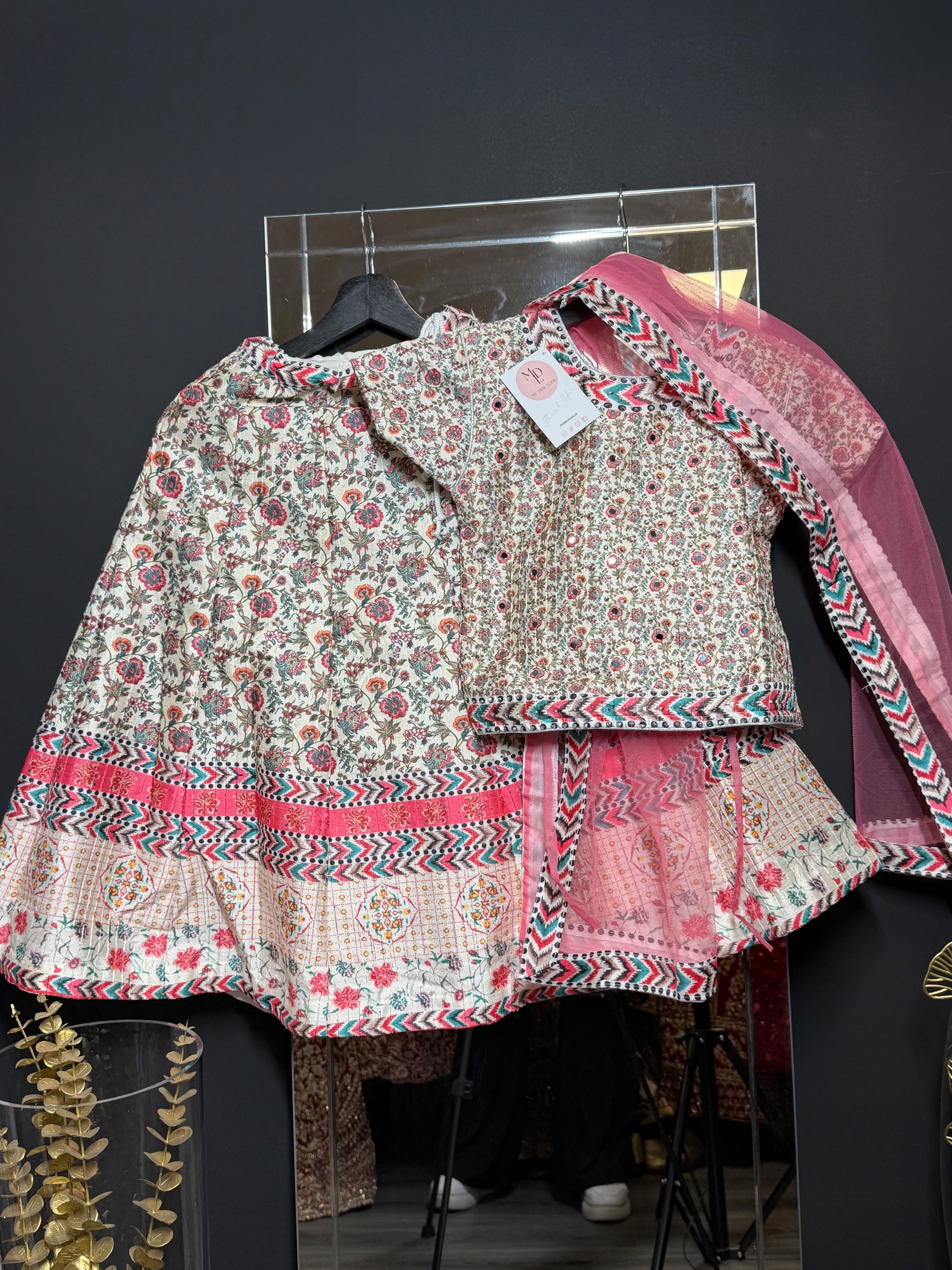 Stijlvolle crème lehenga met bloemenprint en roze dupatta. Perfect voor zomerse feesten en pre-wedding events.