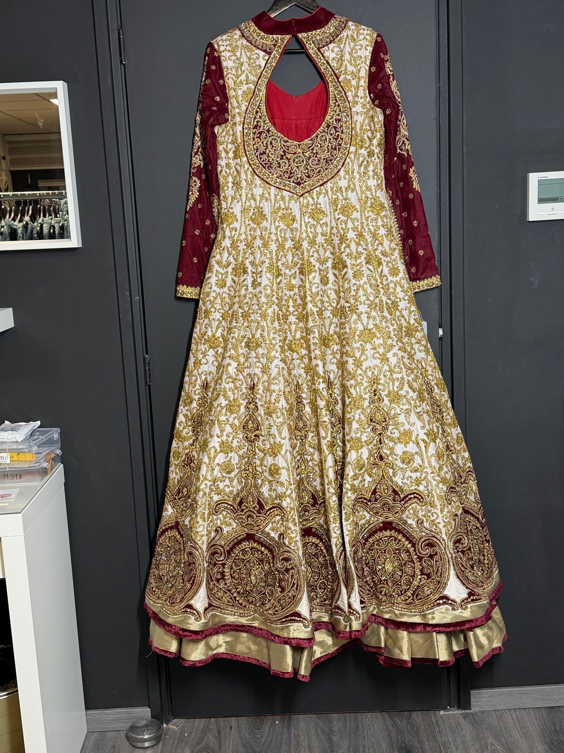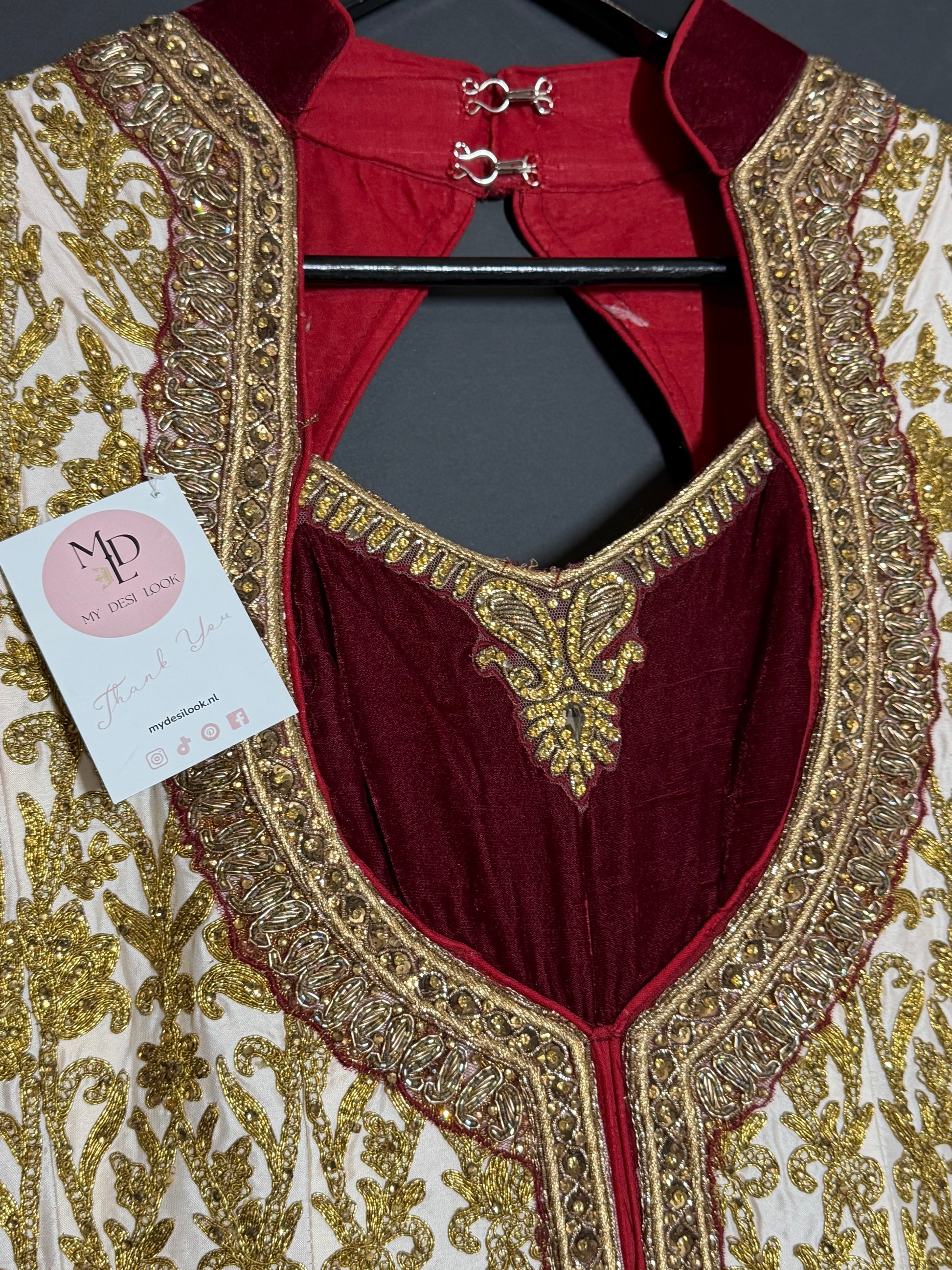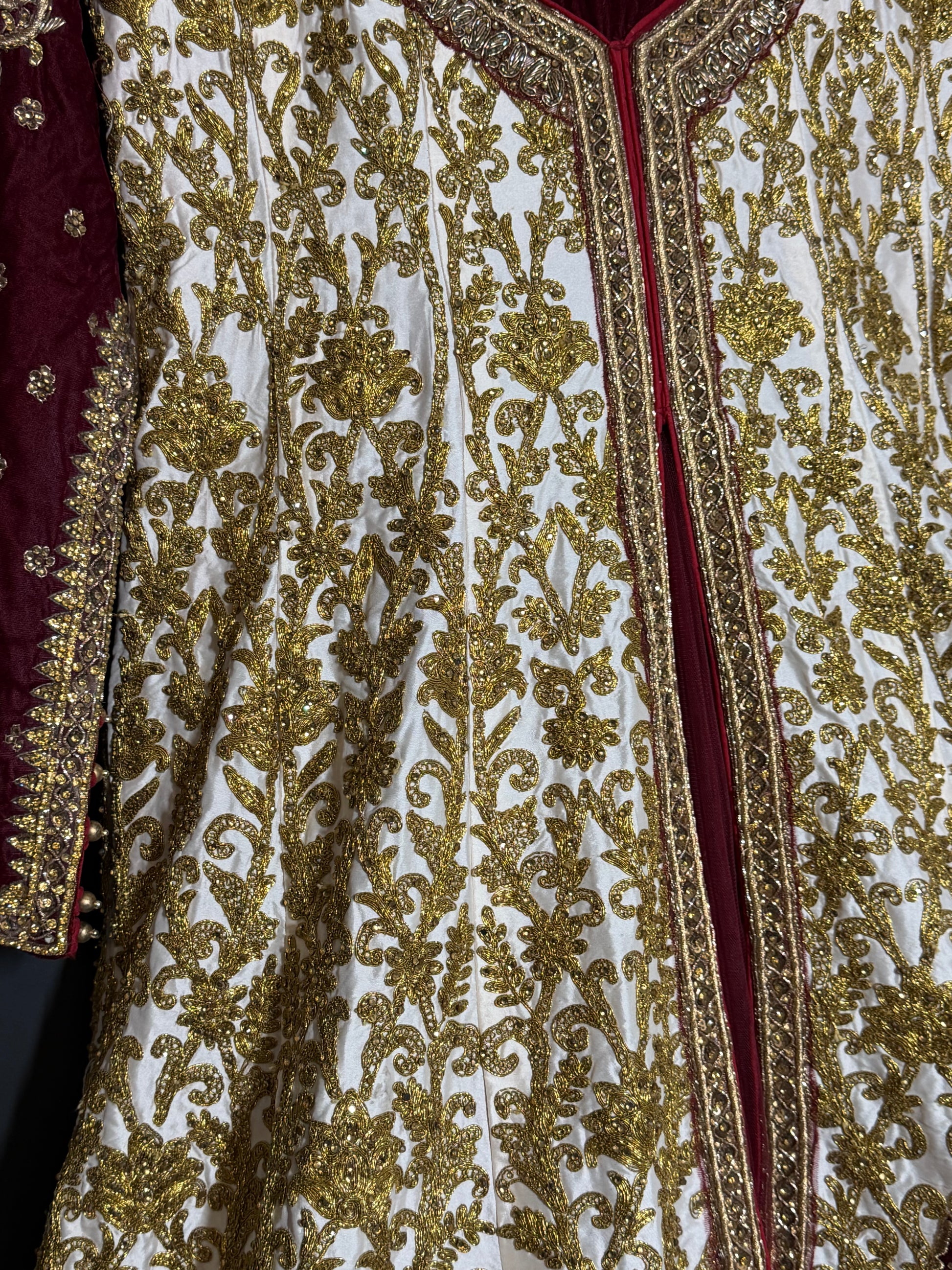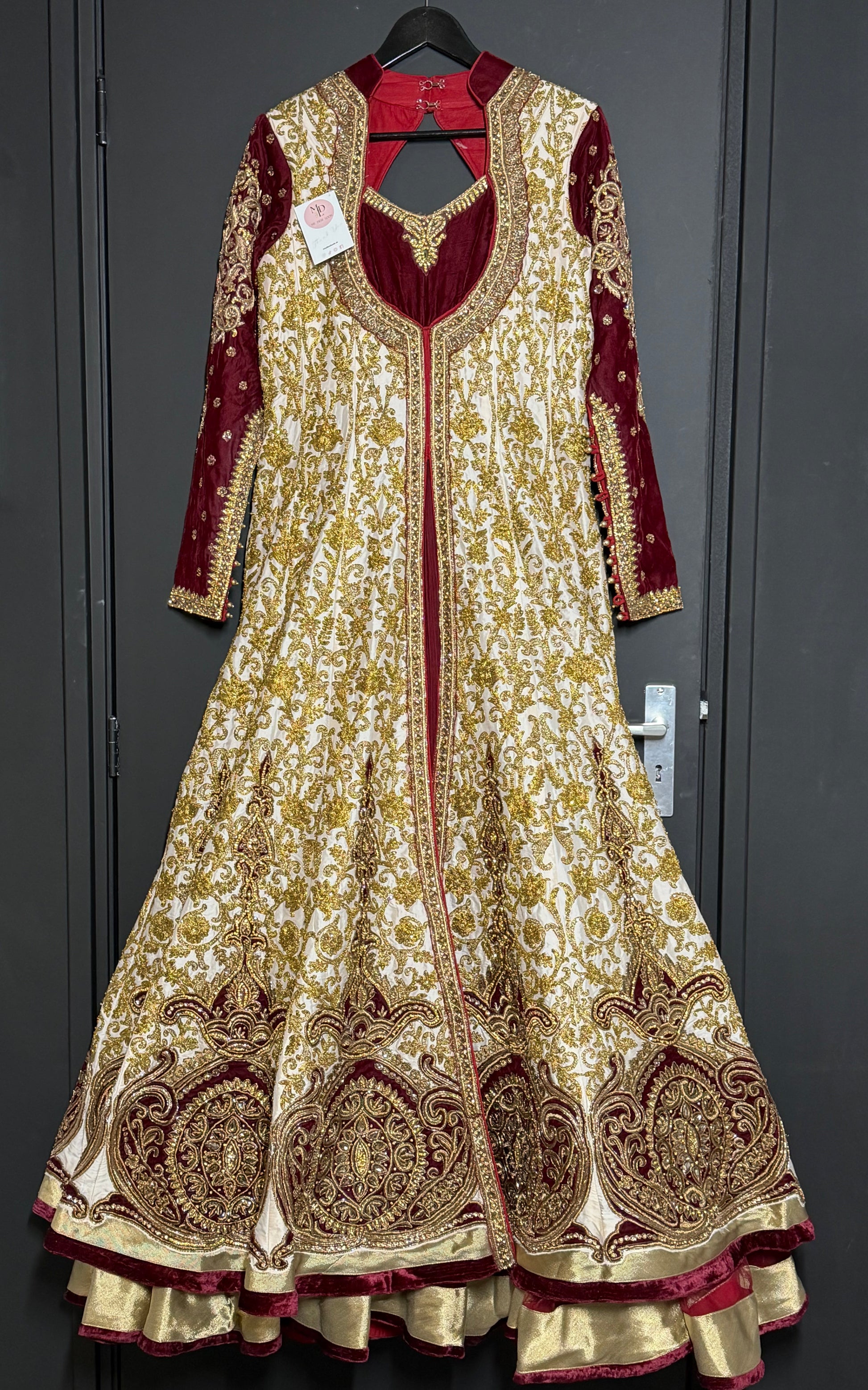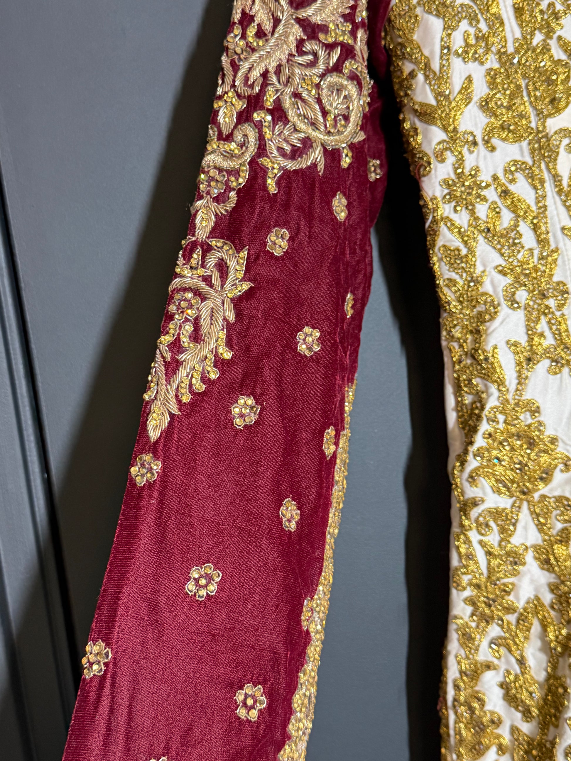 Exclusieve lange bridal jurk in crème en bordeaux met luxe goudborduurwerk. Elegant en tijdloos.