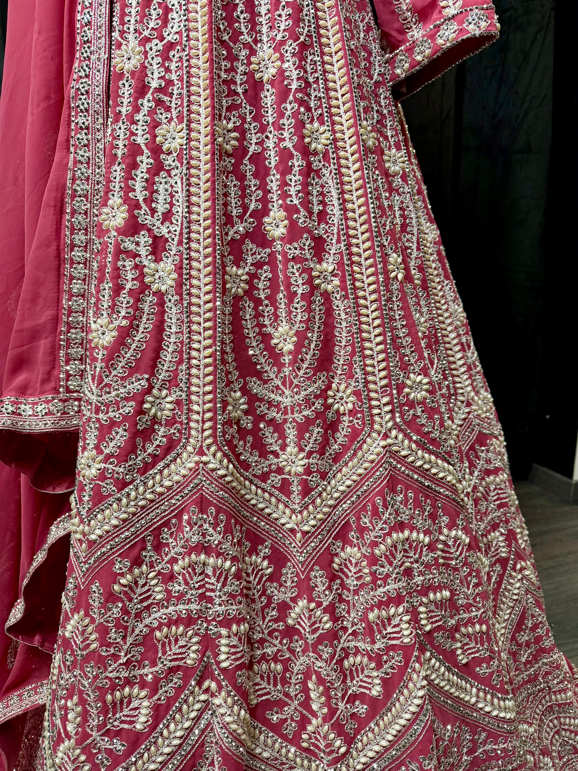 Deze deep pink (ook in paars) Anarkali is geïnspireerd op royal bridal wear, maar perfect voor feestgasten die houden van kleur en luxe. De jurk is rijk gedecoreerd met steentjes, parels, resham en zardosi borduurwerk. De volle flare en rijke kleur zorgen voor een echte “princess look”.