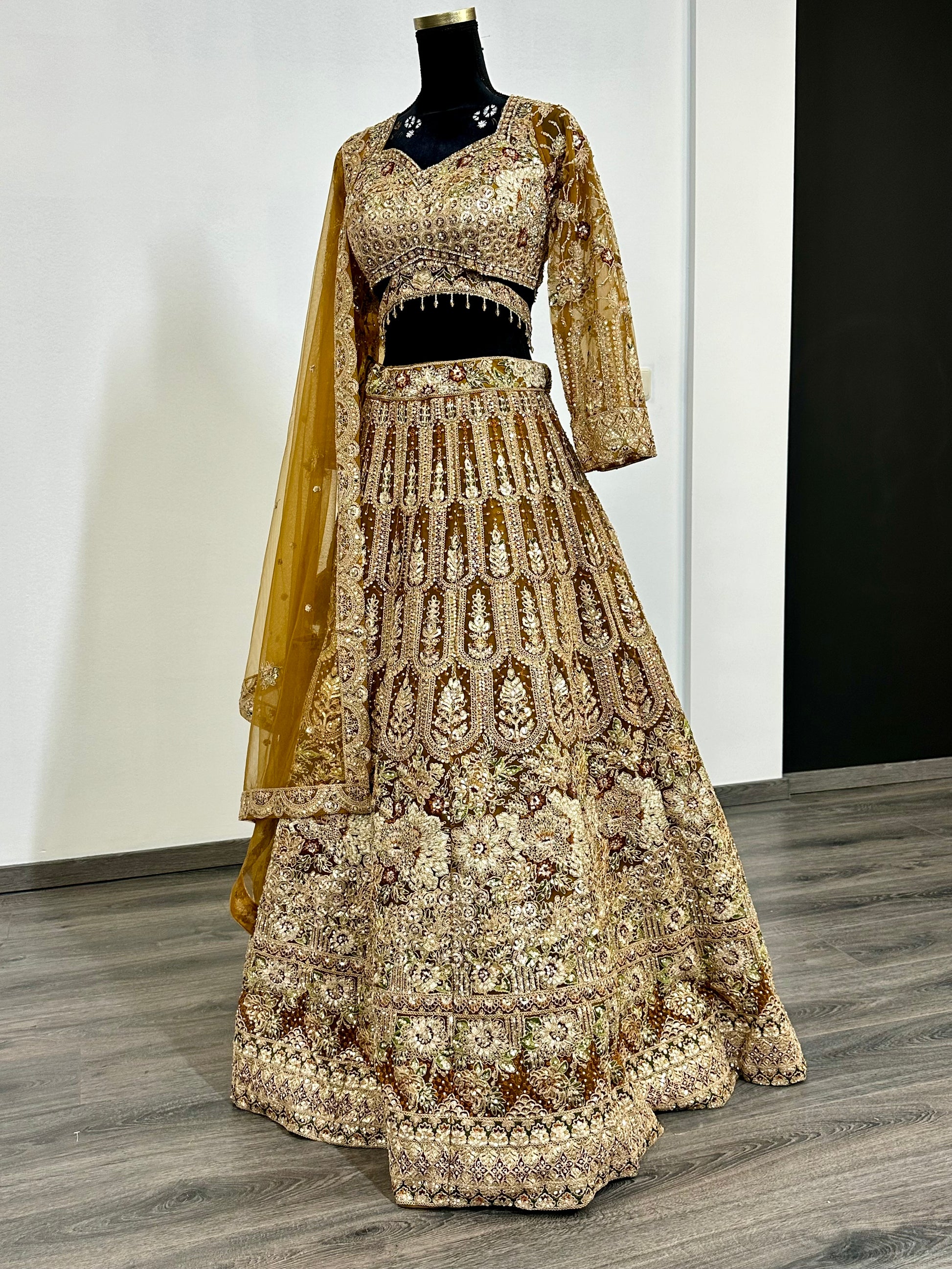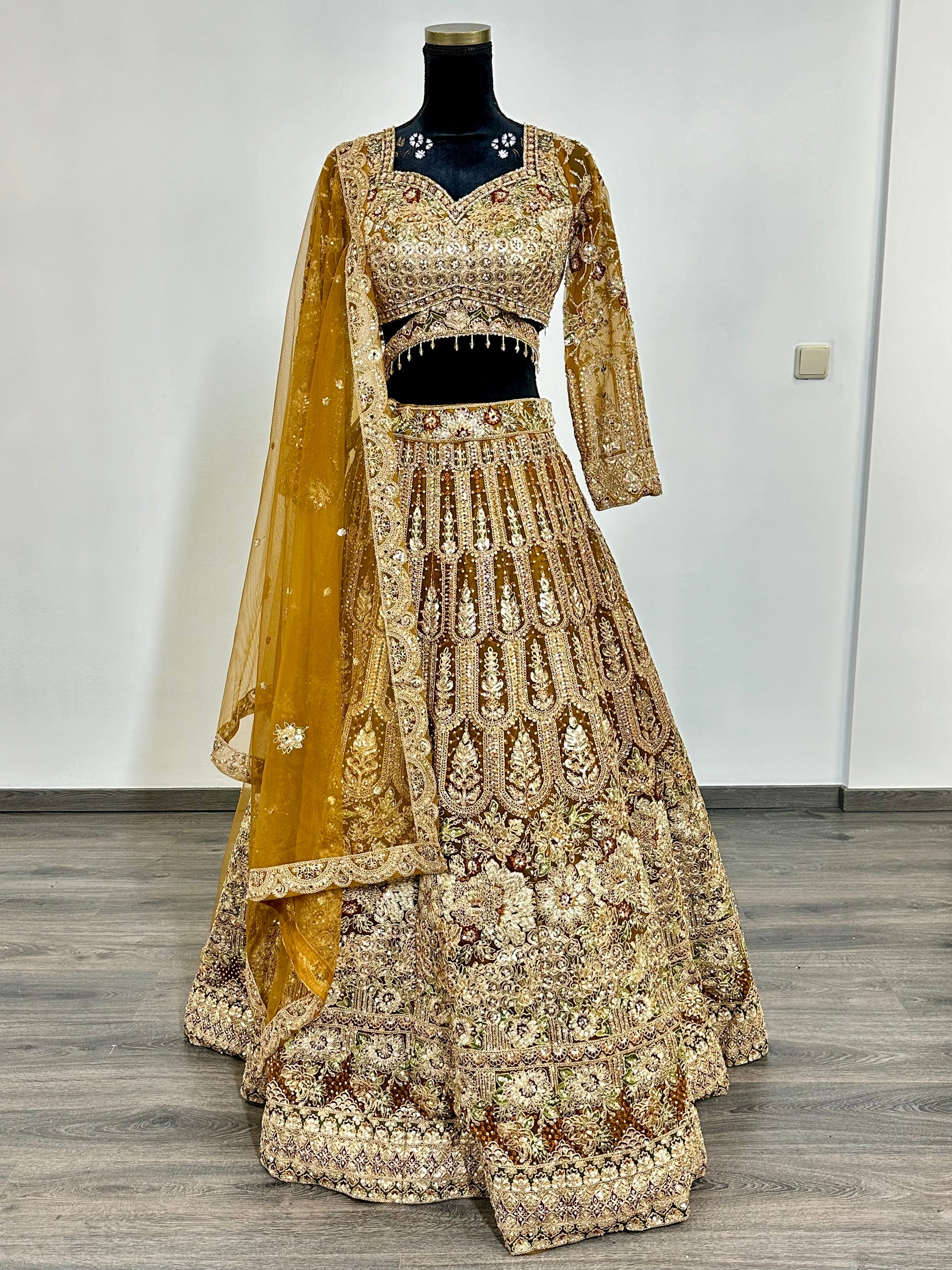 Deze koninklijke gouden gasten lehenga is handgemaakt met schitterende details van spiegelwerk en draadborduur. De warme goudtinten en weelderige afwerking maken dit de ultieme outfit voor een traditionele bruiloft.