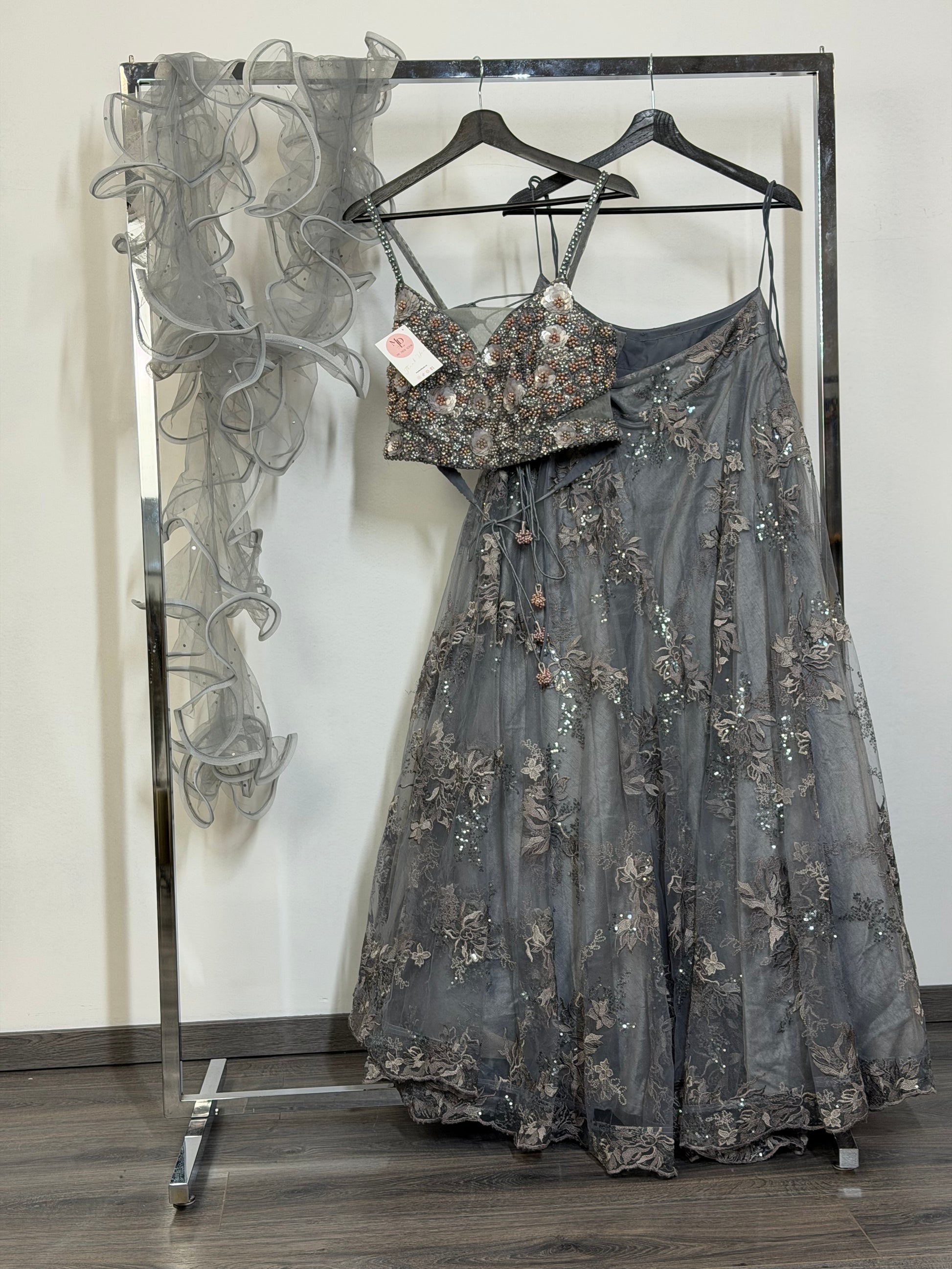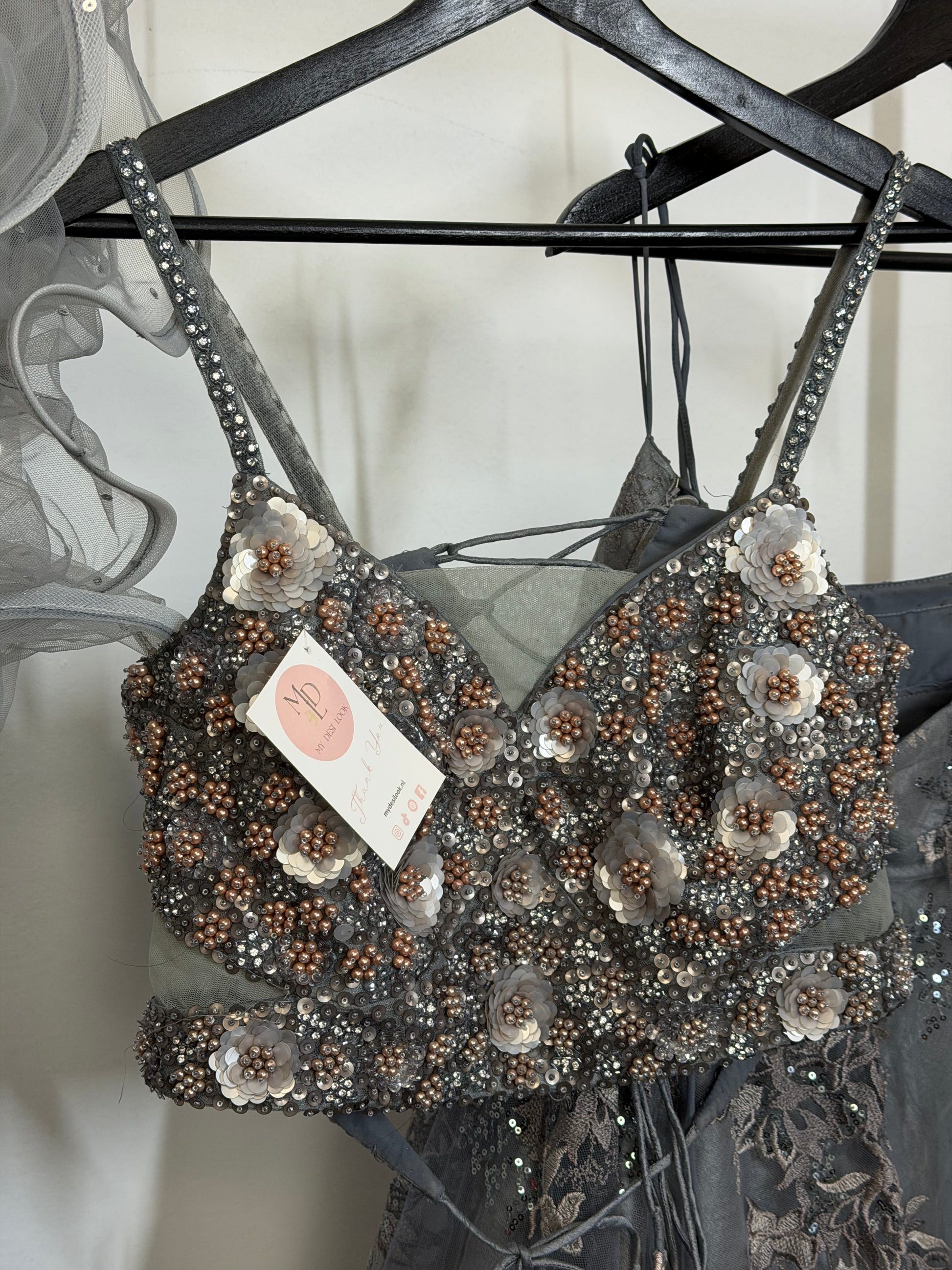 Grijze Designer Lehenga met Heavy 3D Bloemen