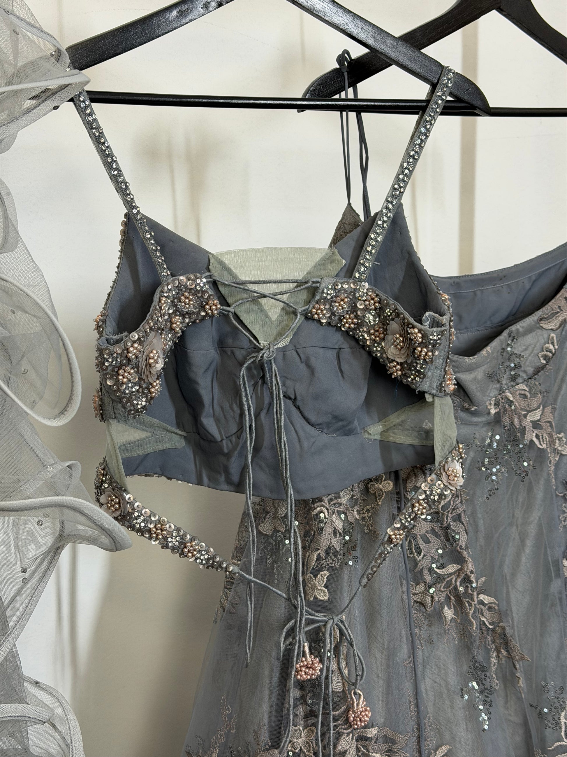 Exclusieve grijze designer lehenga met 3D floral embroidery, steentjes en luxe ruffled dupatta. Een moderne bridal-look voor recepties en avondfeesten.