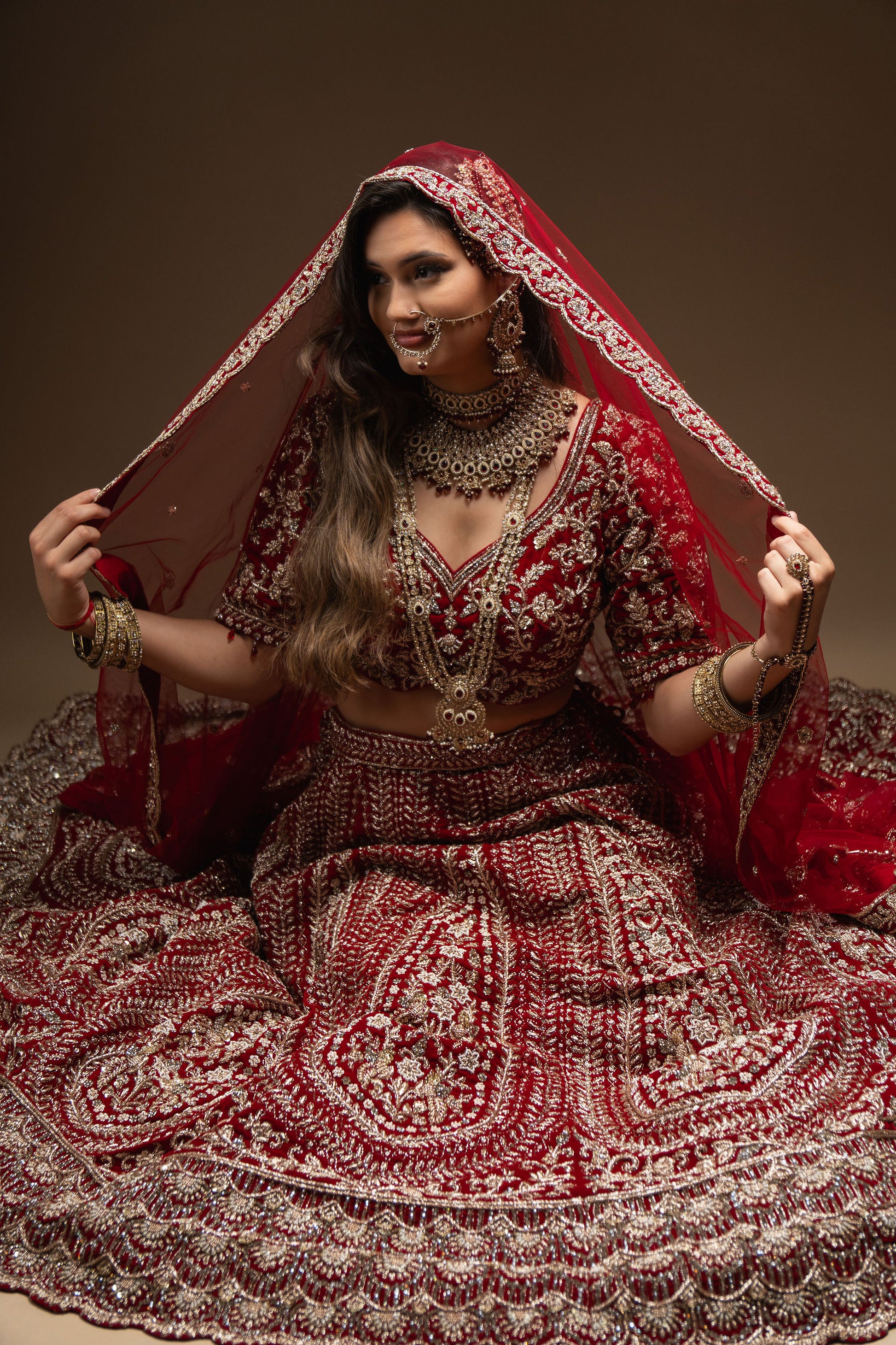 Deze traditionele rode bruidslehenga is een ode aan tijdloze Indiase elegantie. De diepe rode tint, gecombineerd met fijn handgeborduurd goud- en zilverdraadwerk, straalt luxe en koninklijke allure uit. De rijk gedetailleerde rok (lehenga) loopt sierlijk uit in een prachtige sleep, terwijl de kortere blouse (choli) en de lichte dupatta met subtiele borduurrand de look compleet maken.