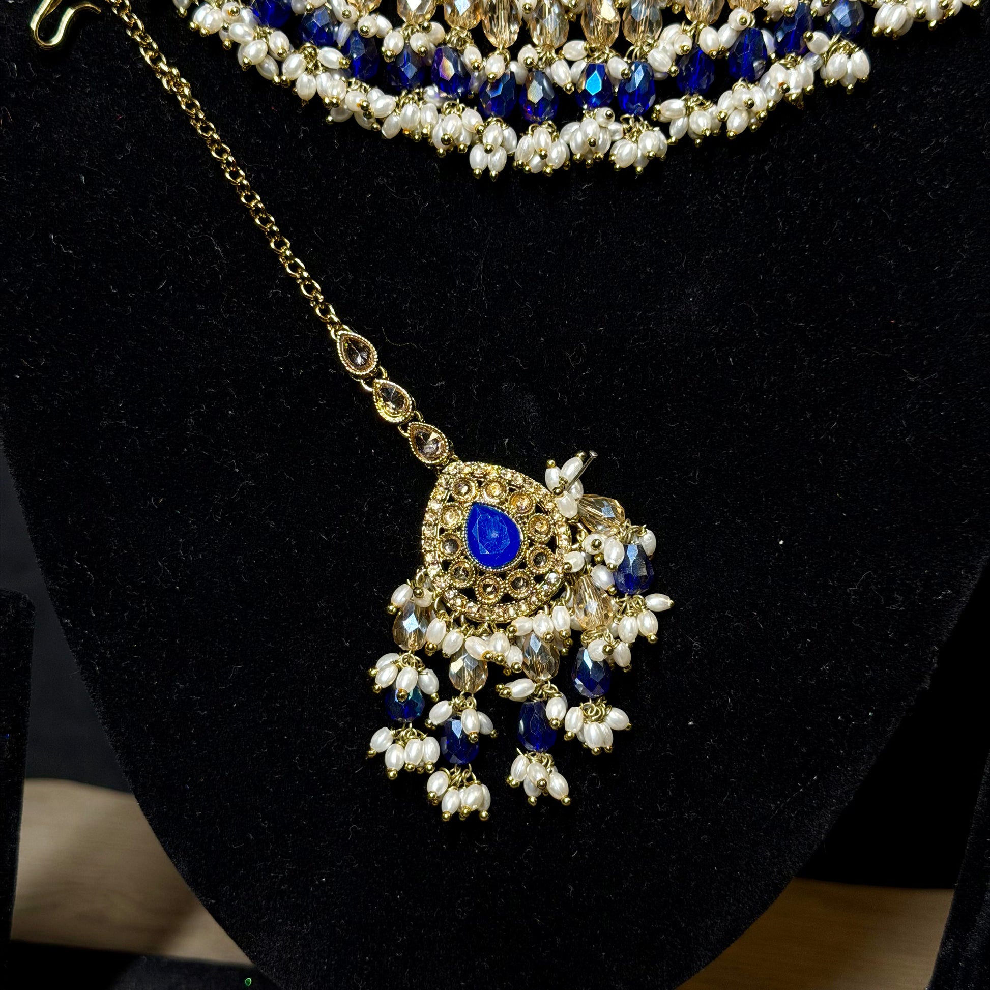 trefwoorden: blauwe Kundan kettingset, Indiase bruidssieraden, parel ketting goud, traditionele sieraden