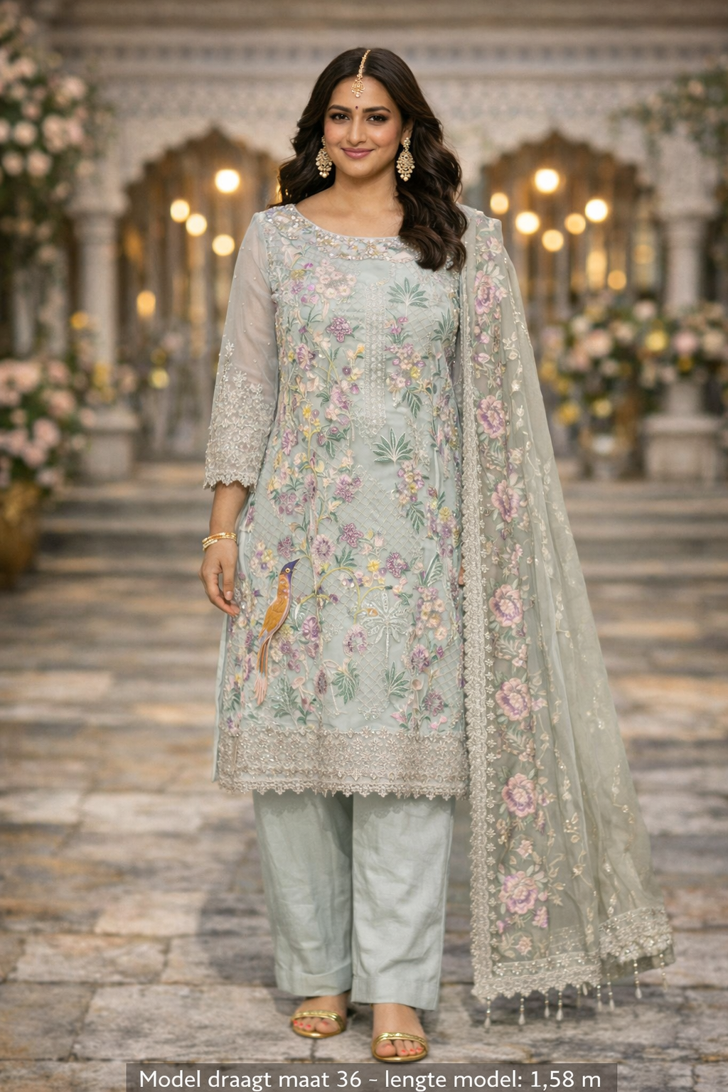 Lichtblauwe set met verfijnd bloemenborduurwerk en luxe dupatta. Perfect voor feesten en zomerse gelegenheden.