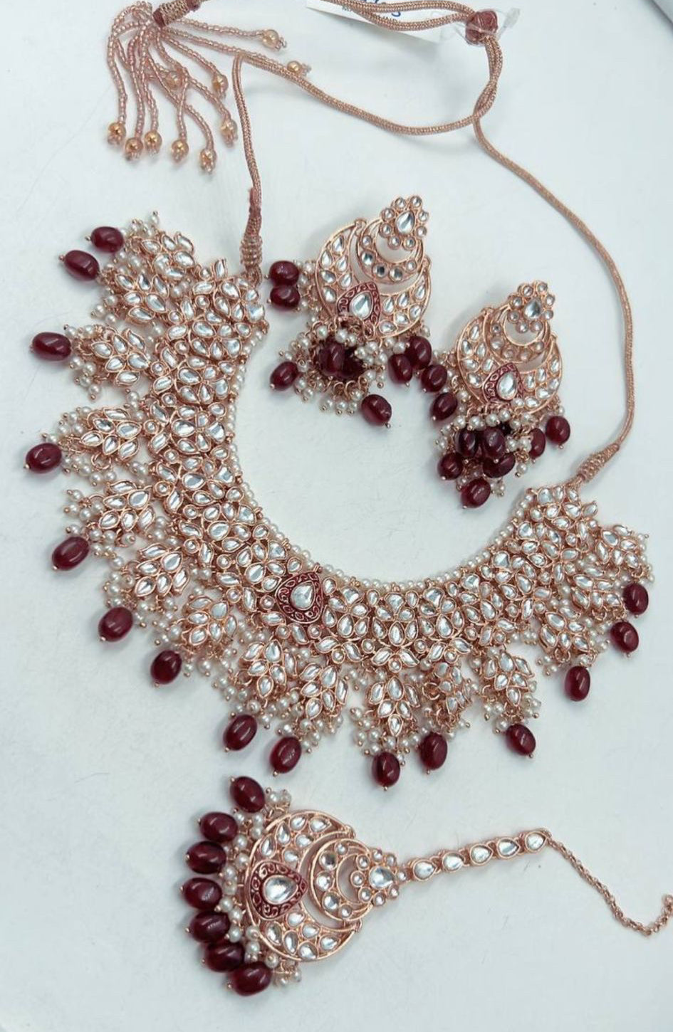 Luxe Bordeauxrode Kundan Kettingset met Druppelstenen