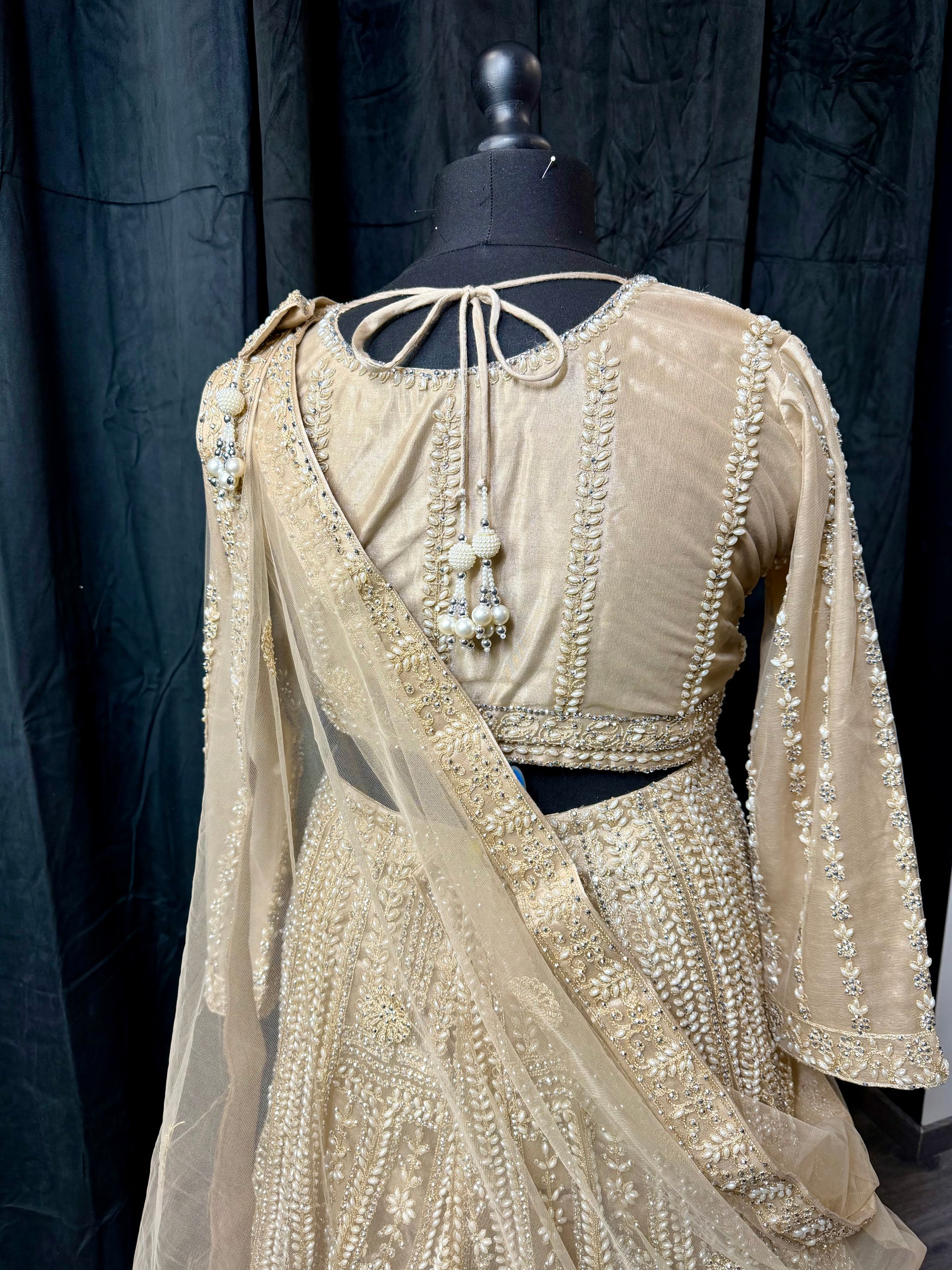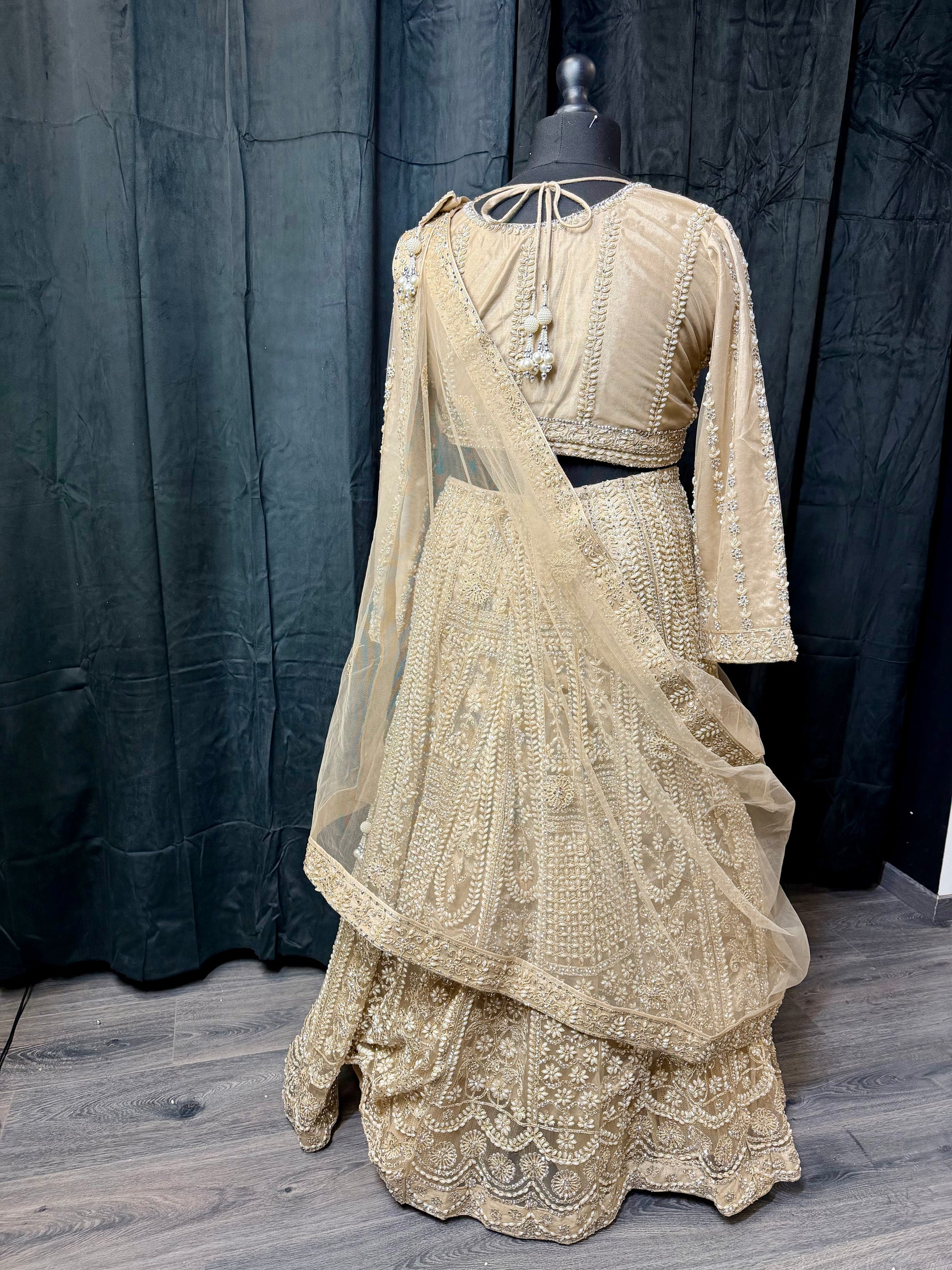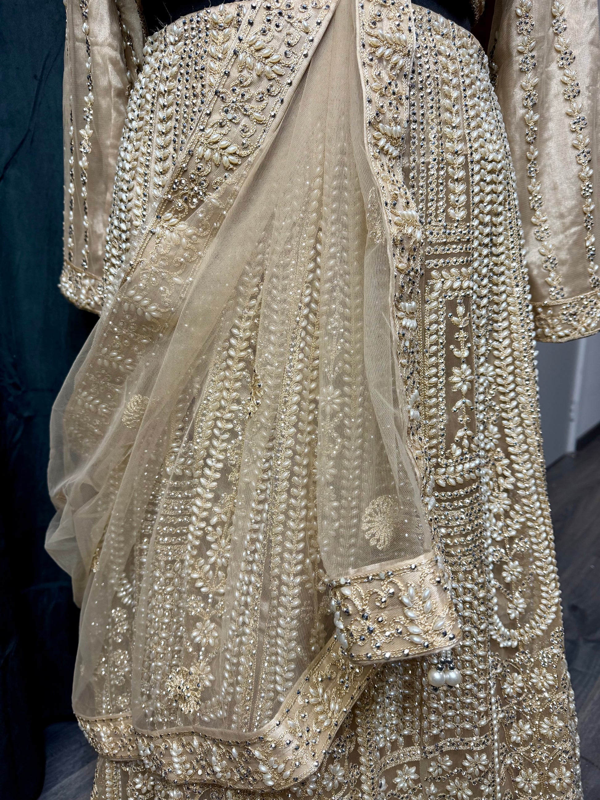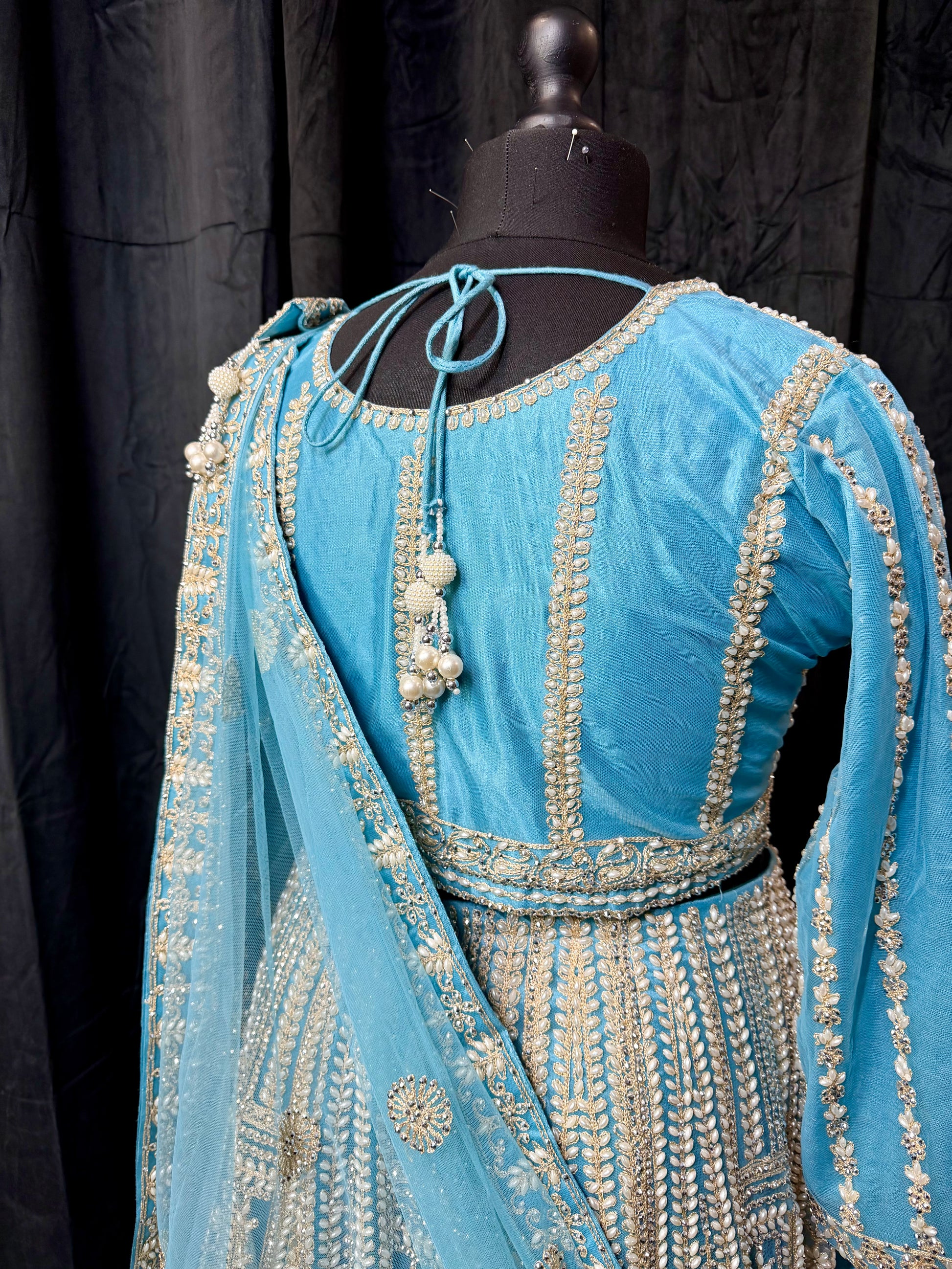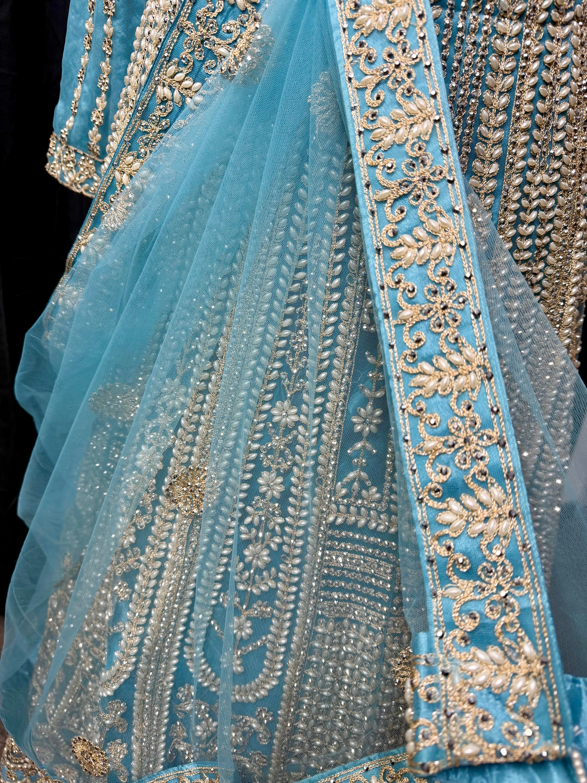 Laat jezelf stralen in onze Luxury Lehenga Set, een statement piece dat direct doet denken aan royal Mughal couture. Deze Indiase feestjurk is verkrijgbaar in twee elegante tinten — Aqua & Champagne Gold — en is volledig met de hand afgewerkt met zware steentjes, parels, zardozi-werk en fine thread embroidery.