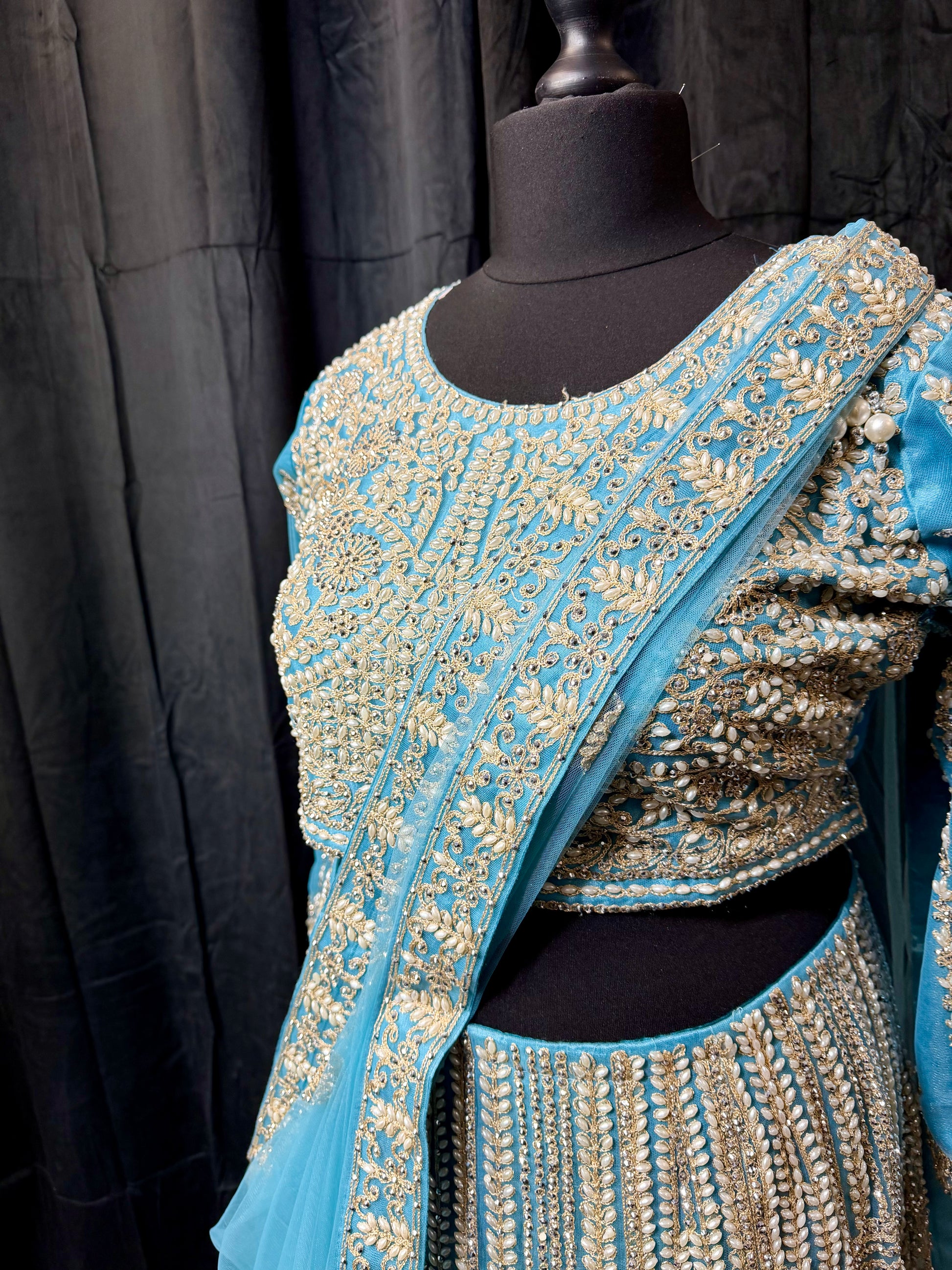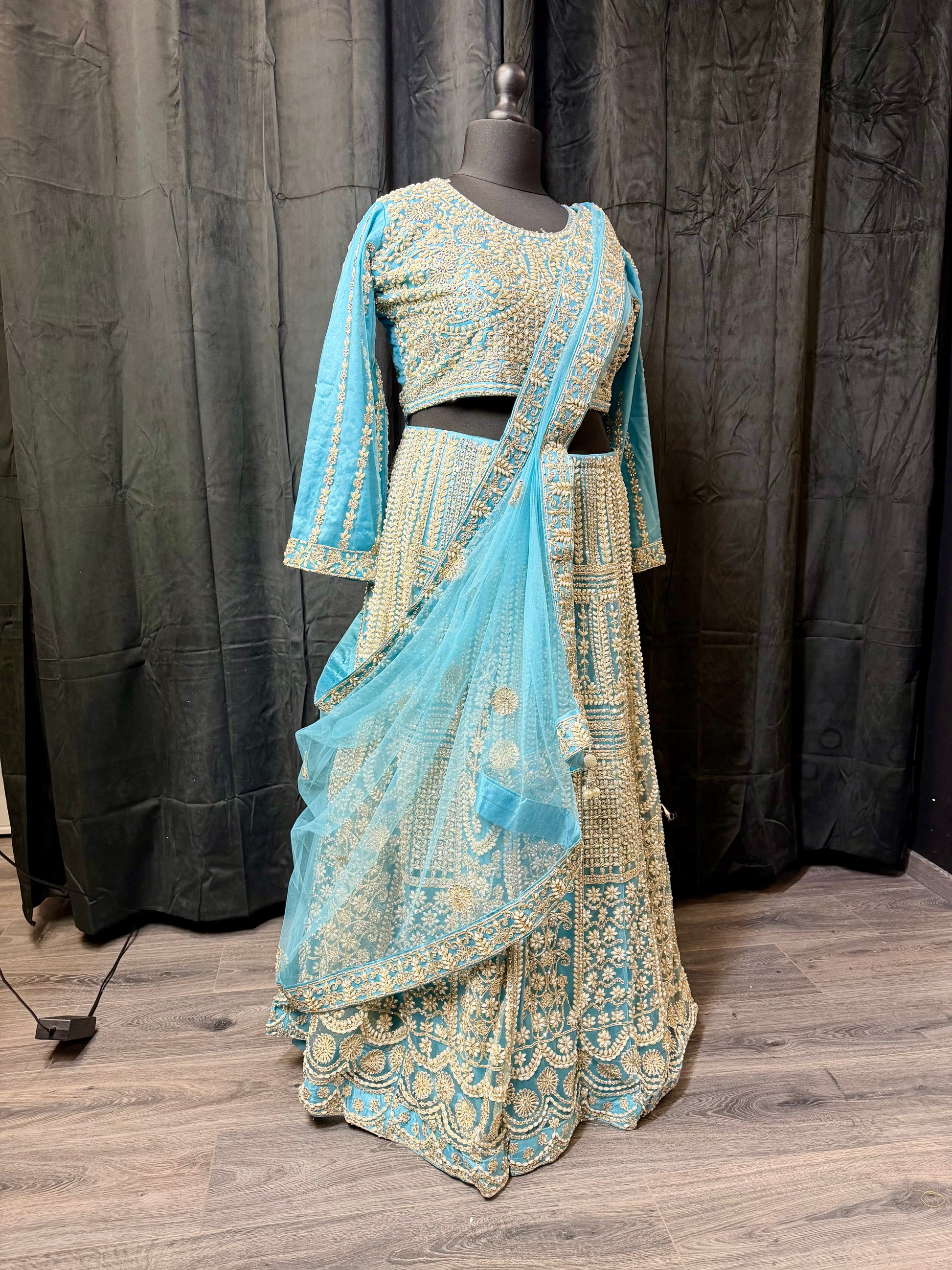 lehenga kopen Nederland, Indiase feestjurk, handgeborduurde lehenga, designer lehenga, aqua lehenga, champagne lehenga, My Desi Look, Indo-Pak couture, Asian partywear NL, bridal guest outfit