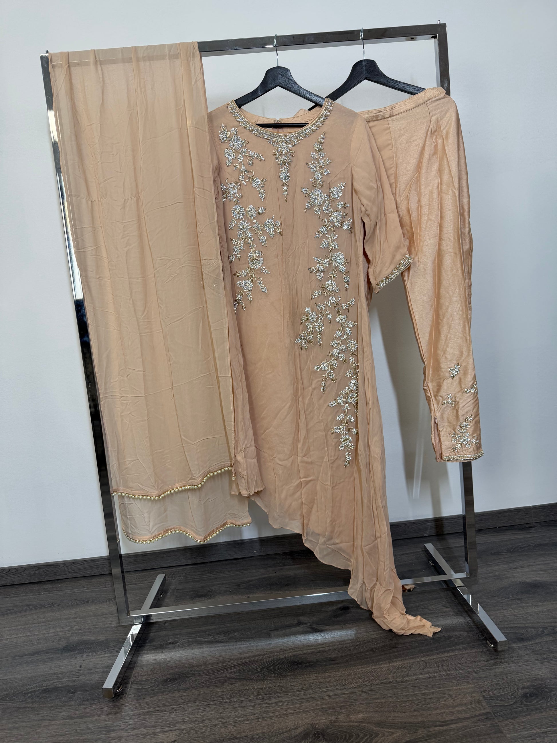 Elegant nude straight-cut pak met verfijnde zilveren handwerk-embroidery. De asymmetrische top en bijpassende dupatta geven de outfit een moderne, zachte uitstraling. Perfect voor feestjes, engagements en family events.