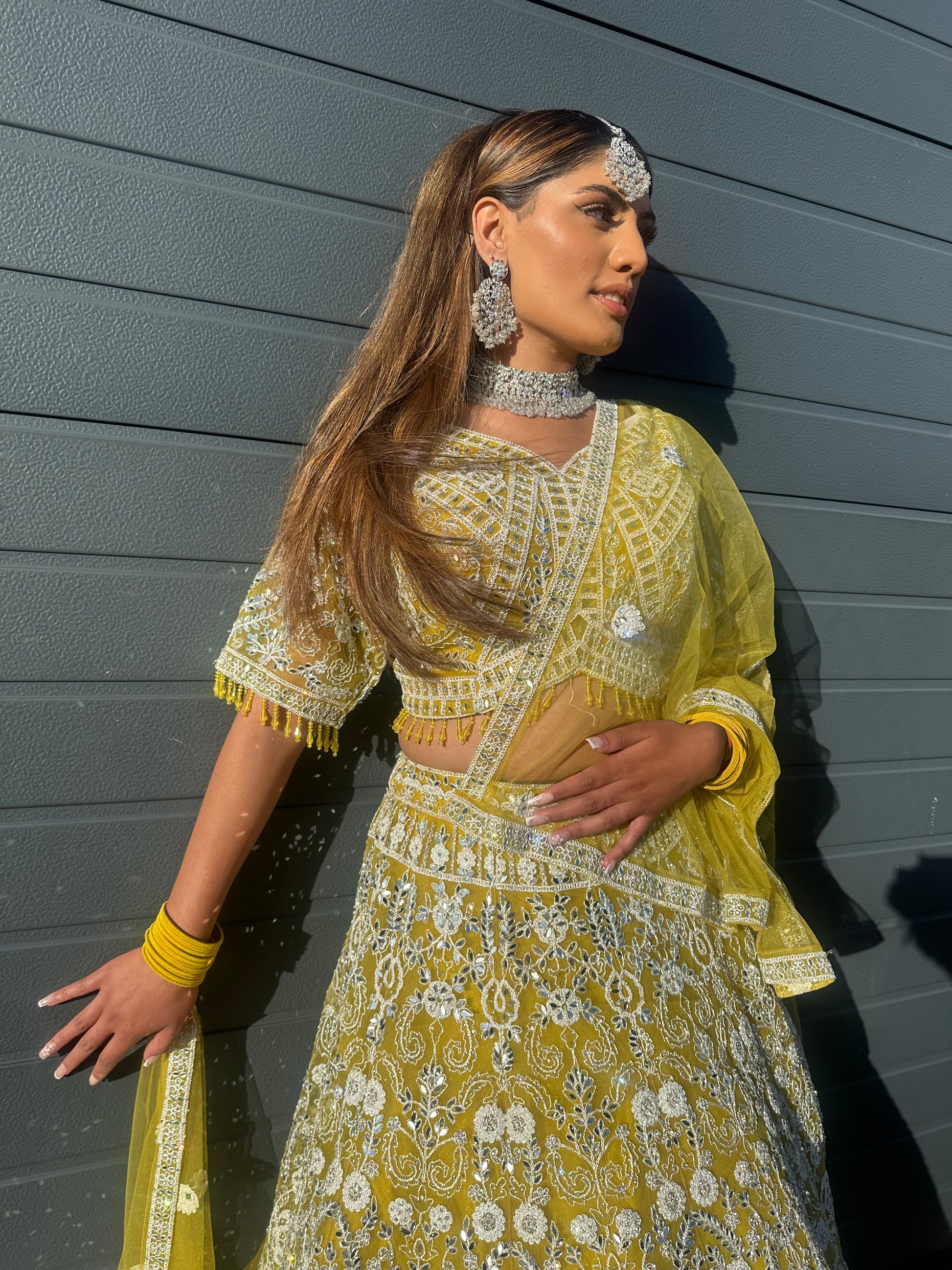 Olijfgroene lehenga met elegant wit borduurwerk en tule dupatta. Perfect voor bruiloften en traditionele feesten. Maat S/M (tailor-fit).