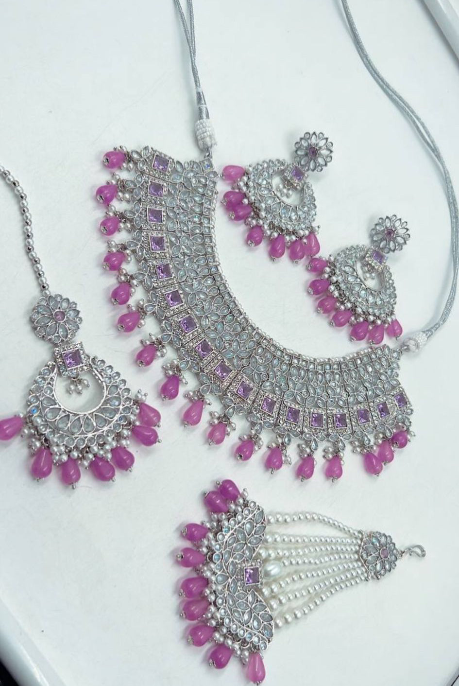 trefwoorden: zilverkleurige kettingset, paarse sieraden, Indiase halsketting, moderne bruidssieraden