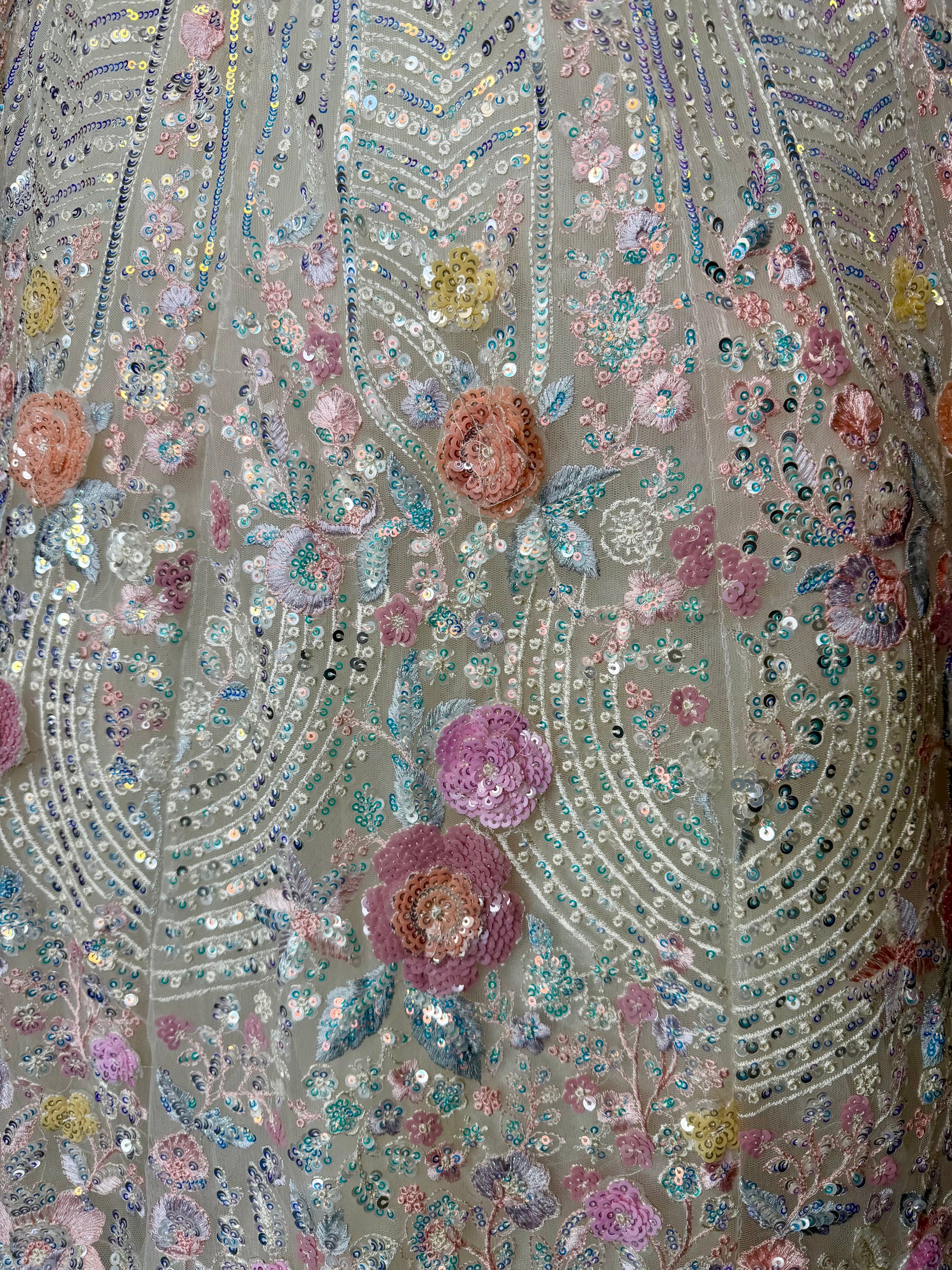 Een zachte, dromerige pastelkleurige Indiase feestjurk vol subtiele glans en bloemige details. De 3D bloemen en parelakcenten geven een luxe, moderne uitstraling zonder te overdrijven. Perfect voor dagbruiloften, recepties of een elegant verlovingsmoment.