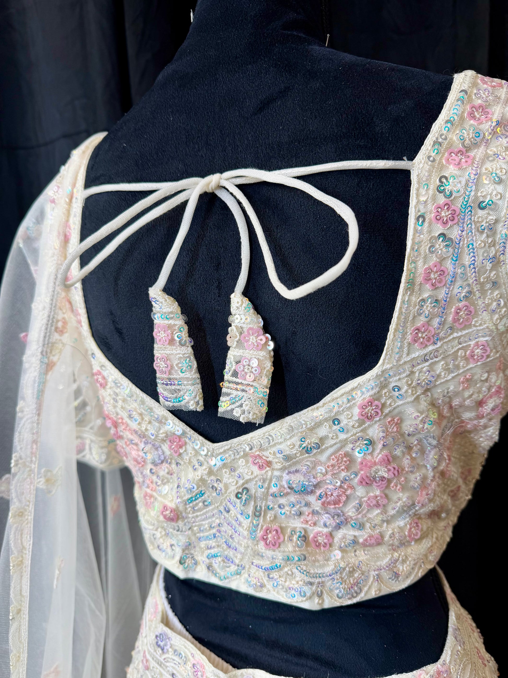 Pastel Garden Lehenga – Ivoor met Bloemen 3D Borduur