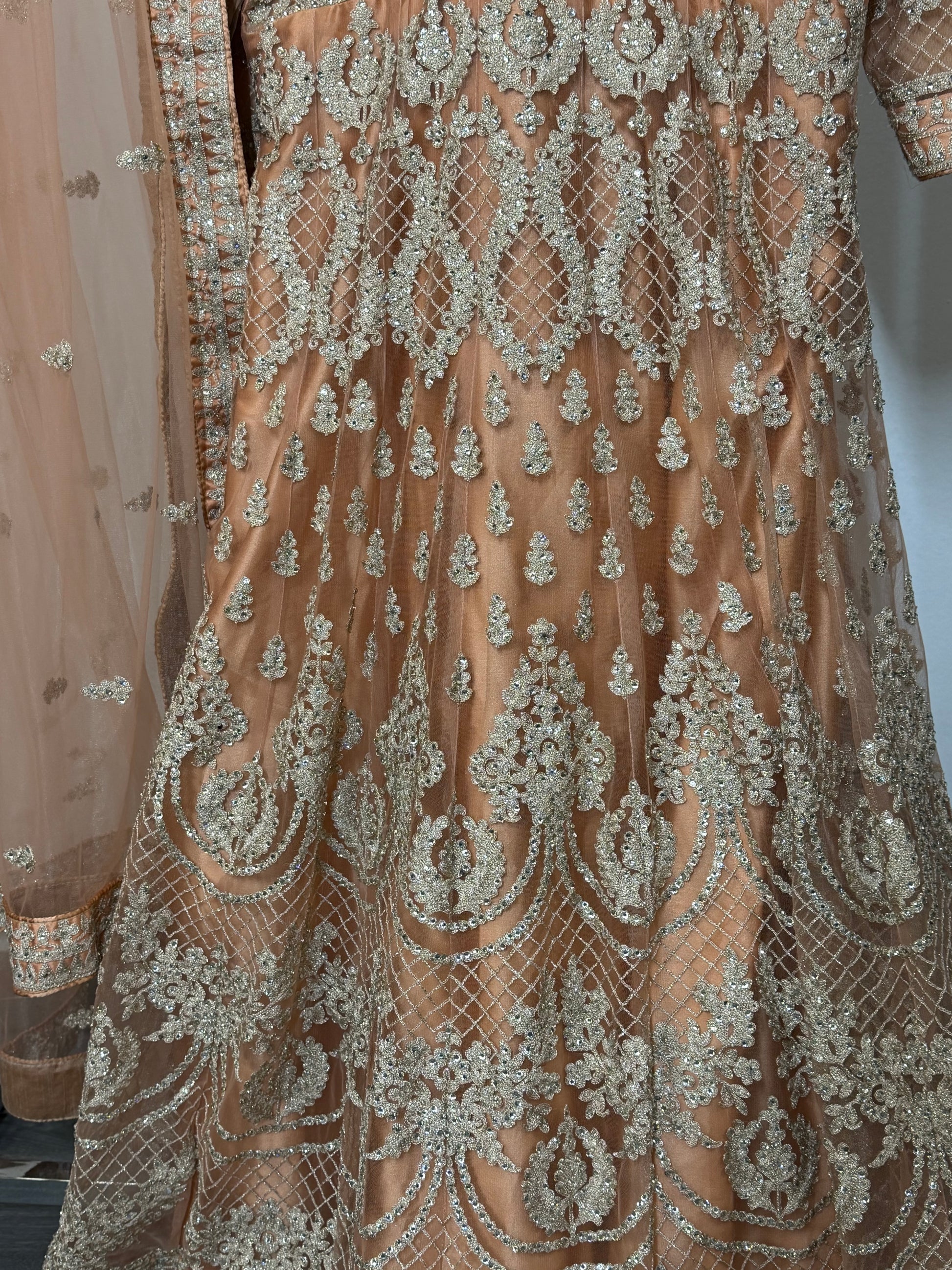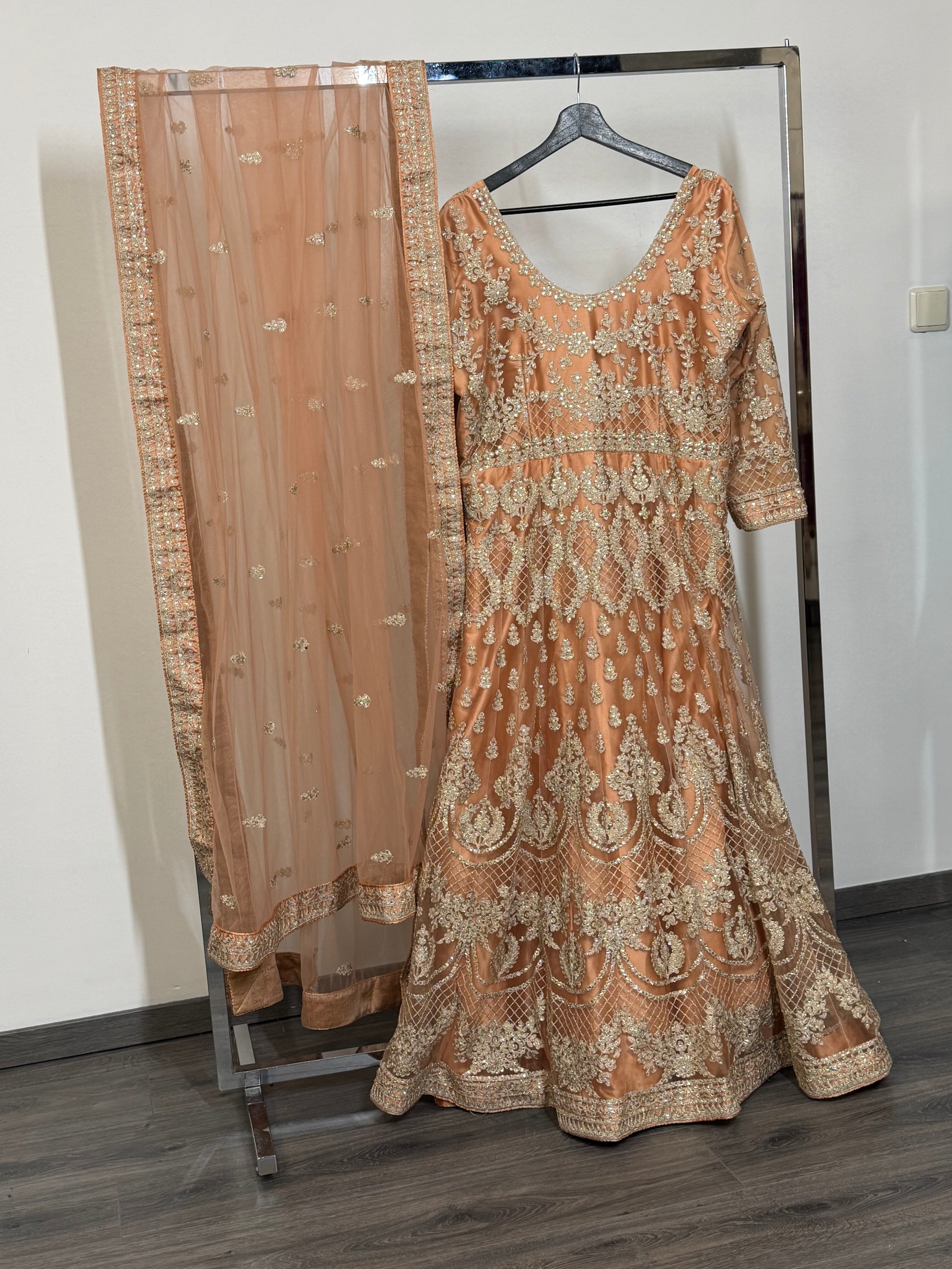 Perzik Anarkali met Goud Borduurwerk & Net Dupatta