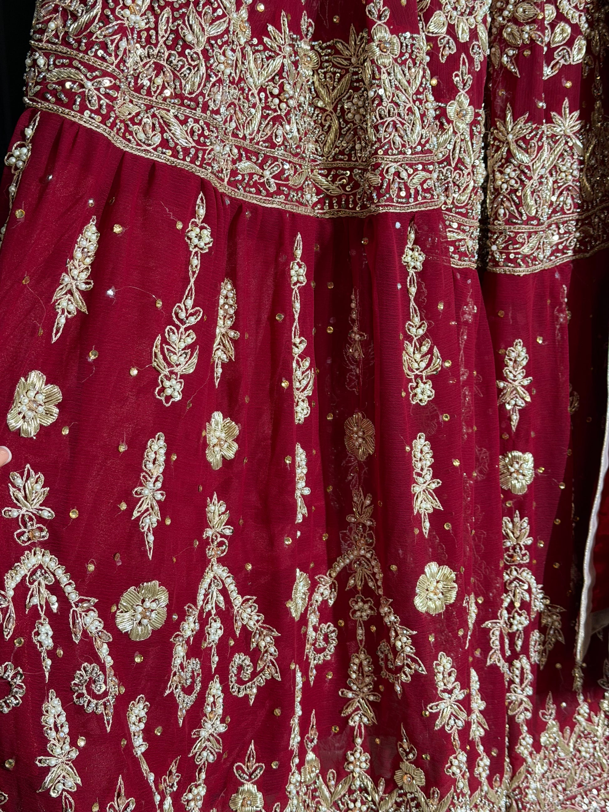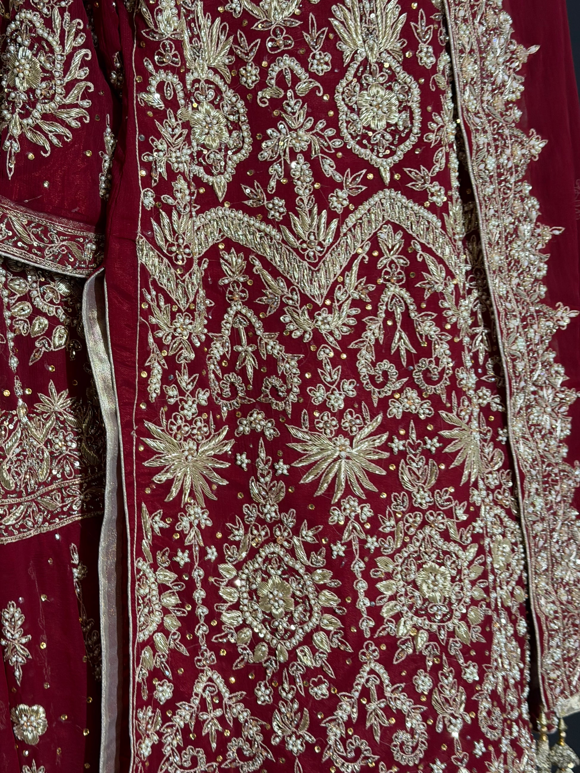 Traditioneel rood bridal pak met rijk goudborduurwerk en luxe dupatta. Ideaal voor nikah en walima.