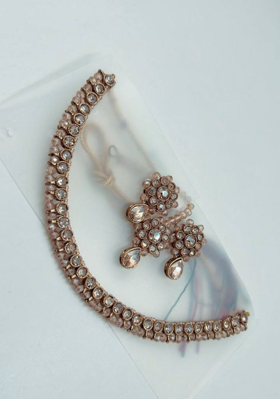 trefwoorden: roségouden kettingset, Indiase sieraden, kristallen ketting, elegante oorbellen set, bruidssieraden