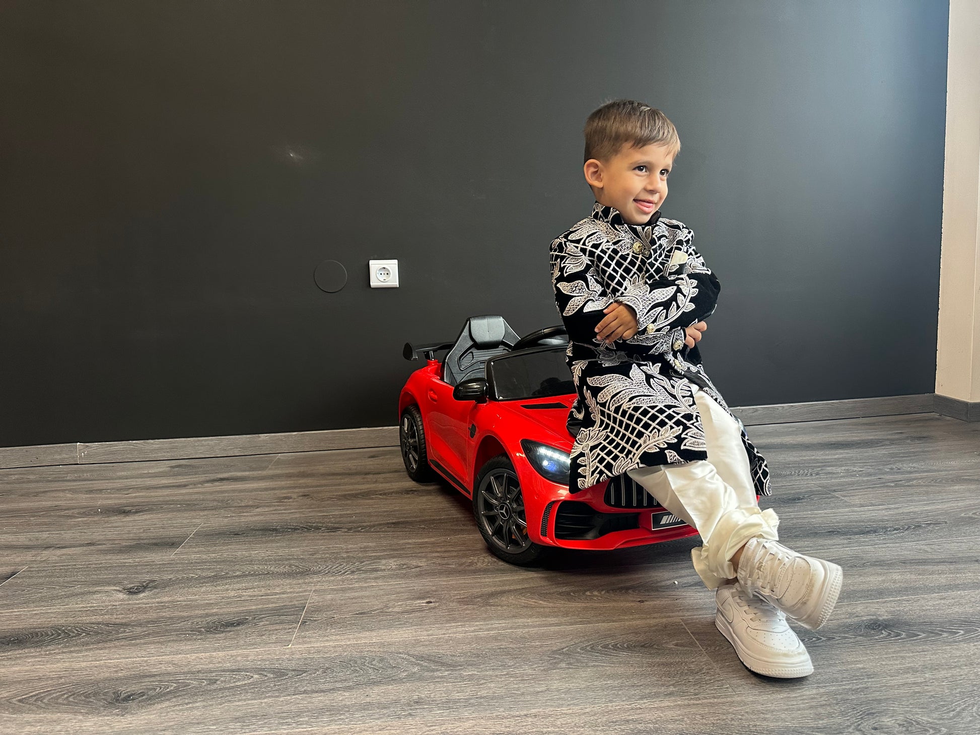 Zwarte velvet sherwani met witte borduursels – luxe Indiase jongensoutfit