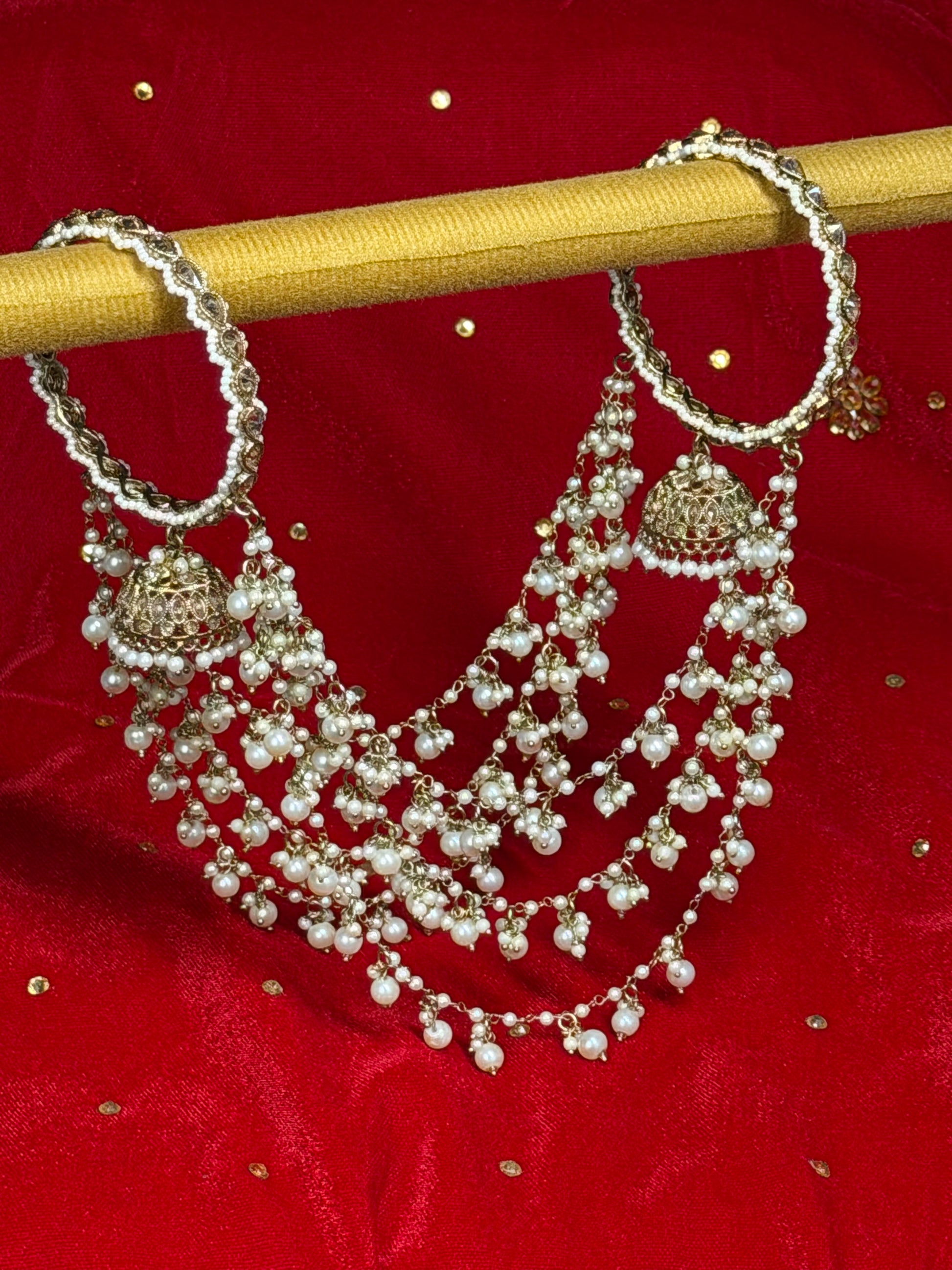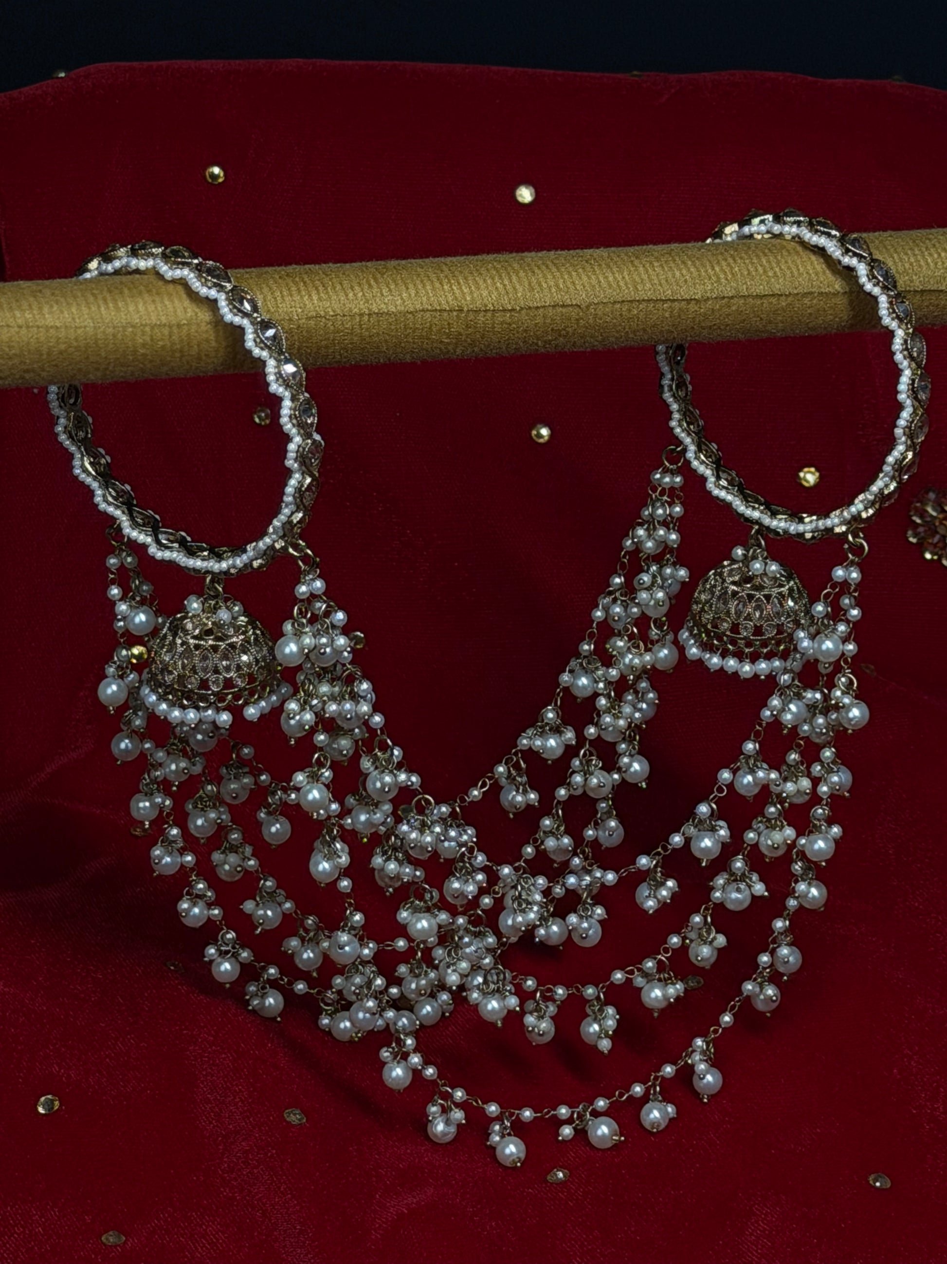 Dit traditionele accessoire is rijk gedecoreerd met parels en fijne kettingen en kan worden gebruikt als haar- of stylingaccessoire. Het gelaagde ontwerp geeft een elegante en klassieke uitstraling, perfect voor speciale gelegenheden en bridal looks.