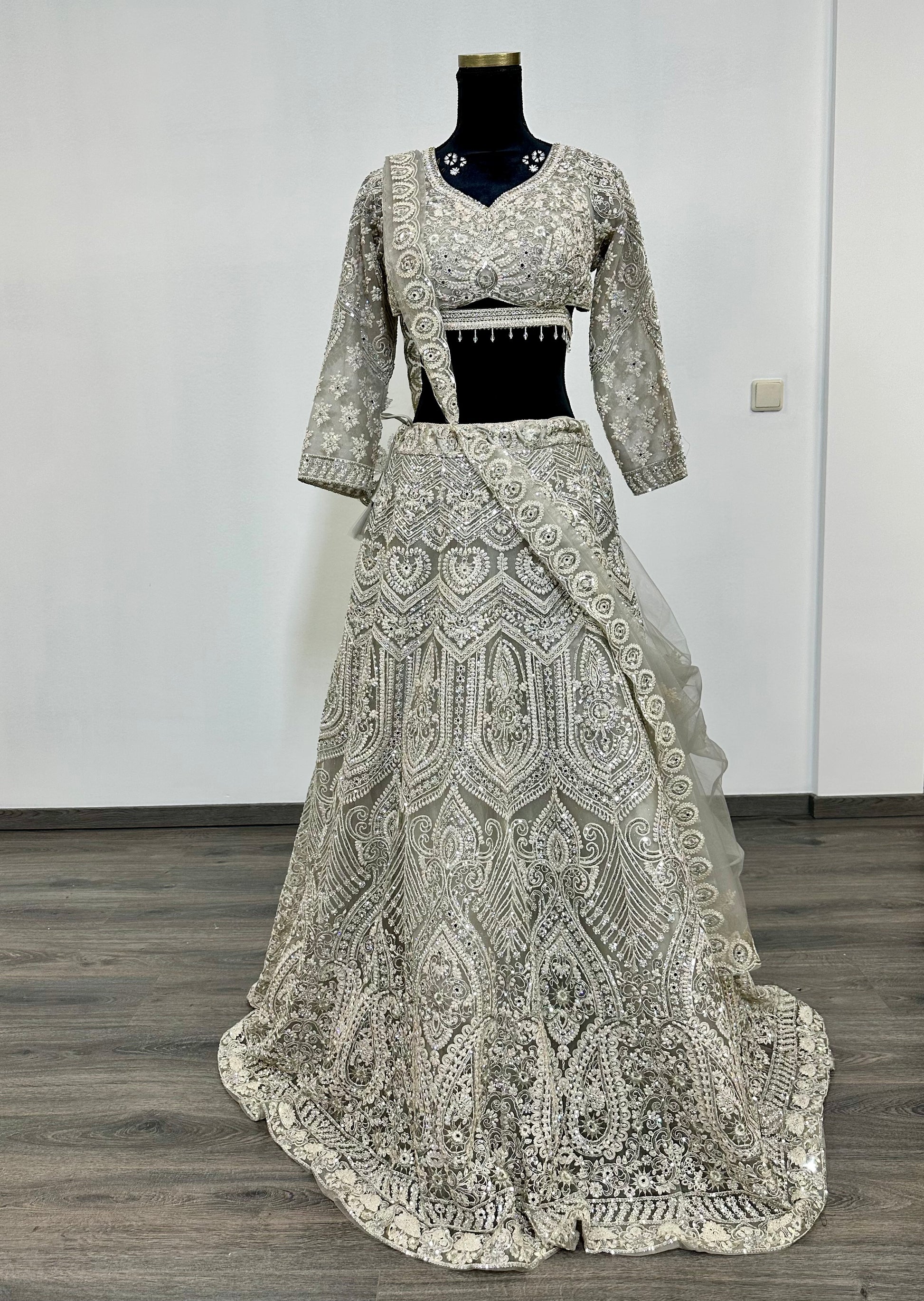 Zilverkleurige lehenga met kristallen en zware borduursels. Perfect voor receptie of feest. Maat S/M (tailor-fit).